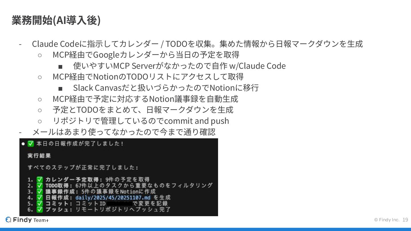 © Findy Inc. 19 業務開始(AI導⼊後) - Claude Codeに指⽰してカレンダー / TODOを収集。集めた情報から⽇報マークダウンを⽣成