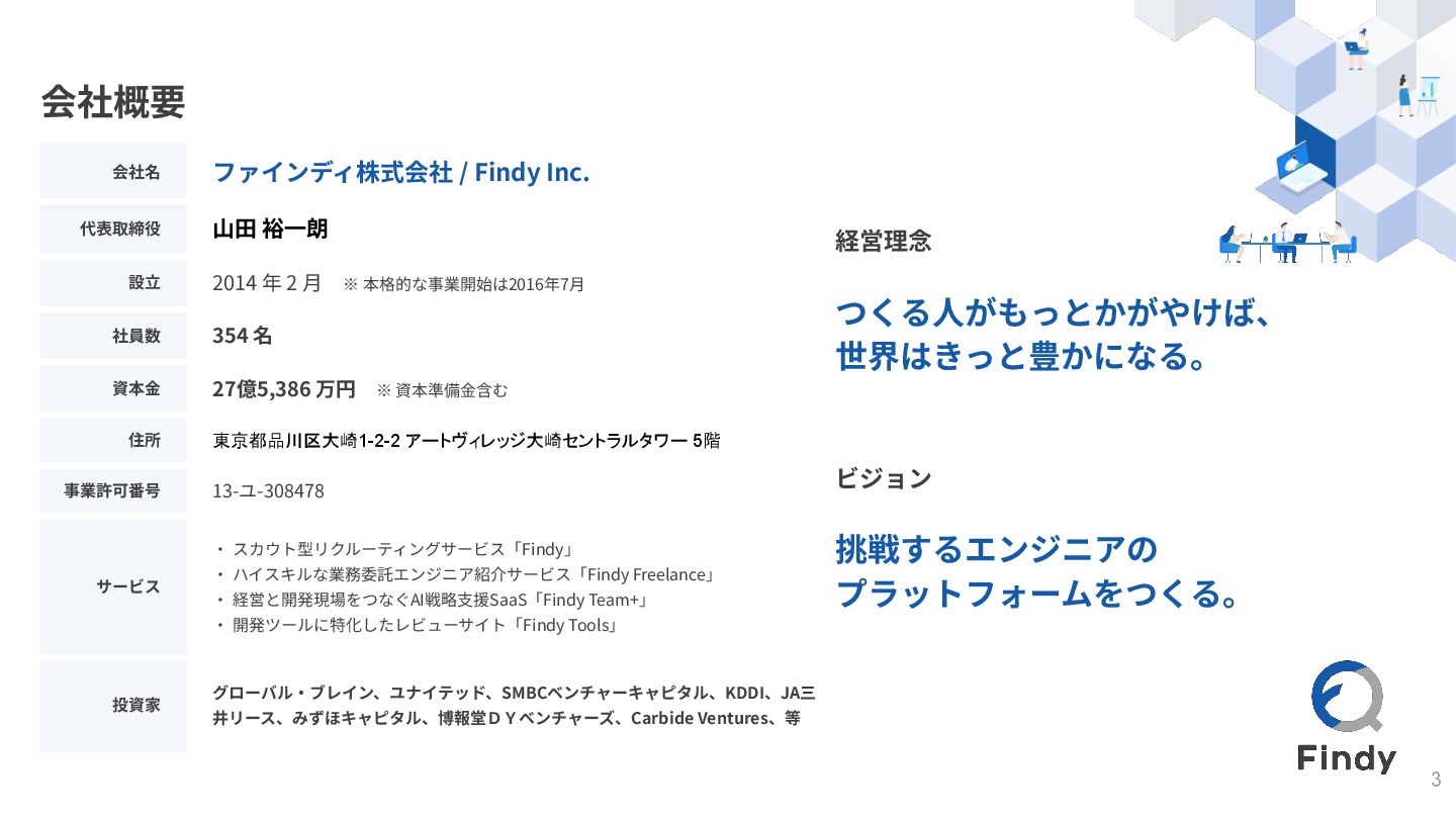 © 2024 Findy Inc. 挑戦するエンジニアの プラットフォームをつくる。 ビジョン つくる⼈がもっとかがやけば、 世界はきっと豊かになる。 経営理念