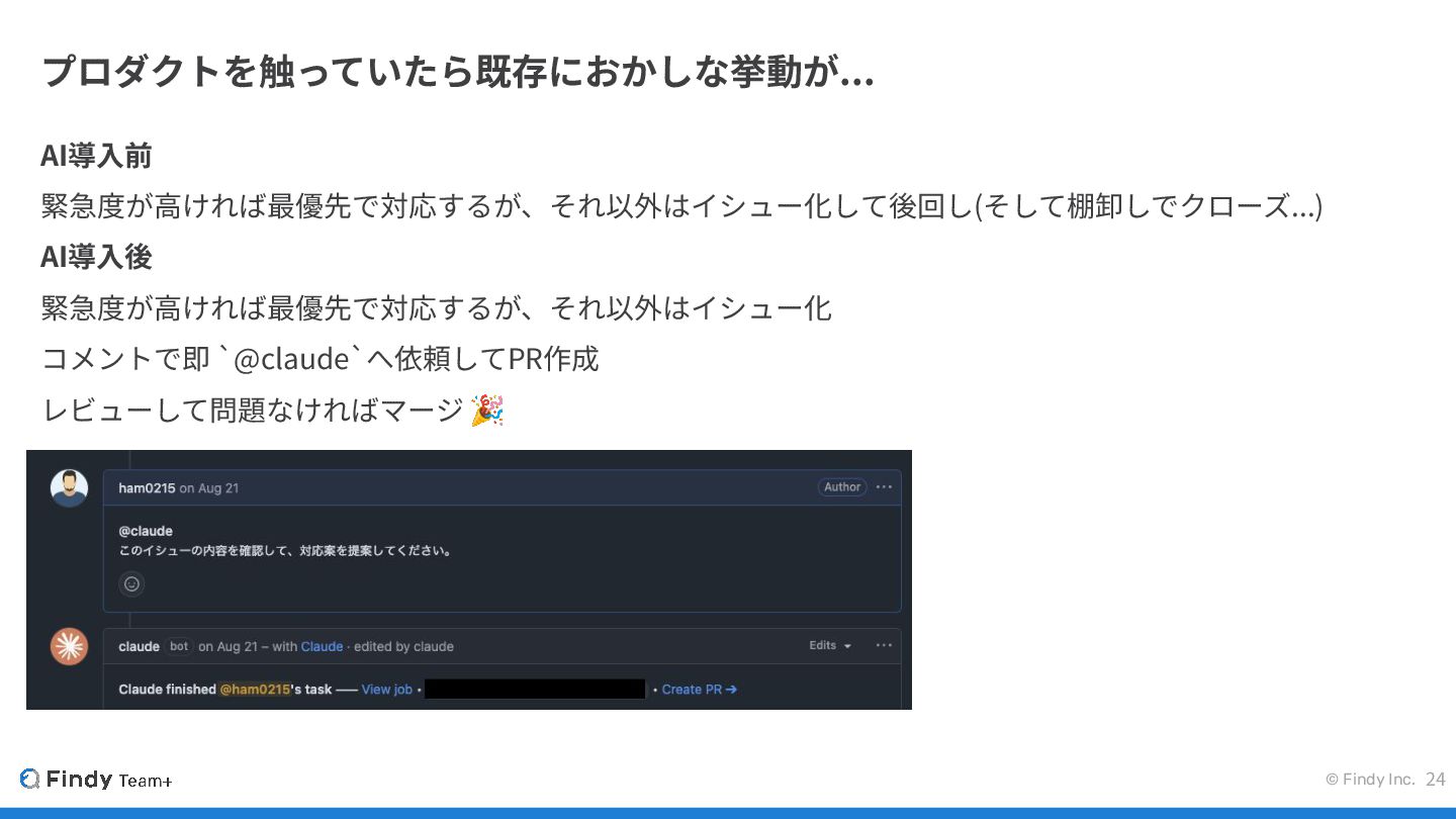 © Findy Inc. 24 プロダクトを触っていたら既存におかしな挙動が... AI導⼊前 緊急度が⾼ければ最優先で対応するが、それ以外はイシュー化して後回し(そして棚卸しでクローズ...) AI導⼊後 緊急度が⾼ければ最優先で対応するが、それ以外はイシュー化 コメントで即