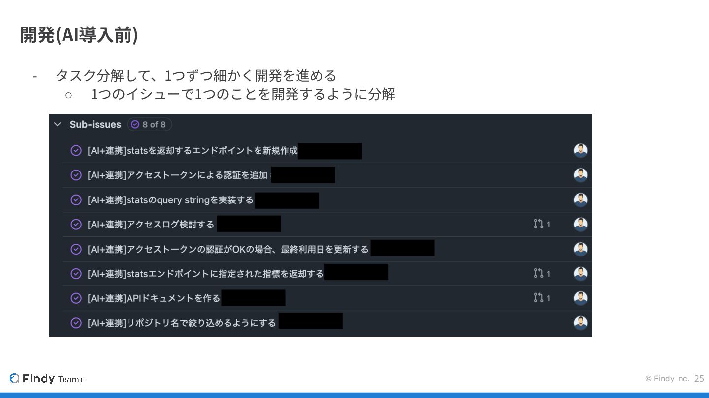 © Findy Inc. 25 開発(AI導⼊前) - タスク分解して、1つずつ細かく開発を進める ◦ 1つのイシューで1つのことを開発するように分解