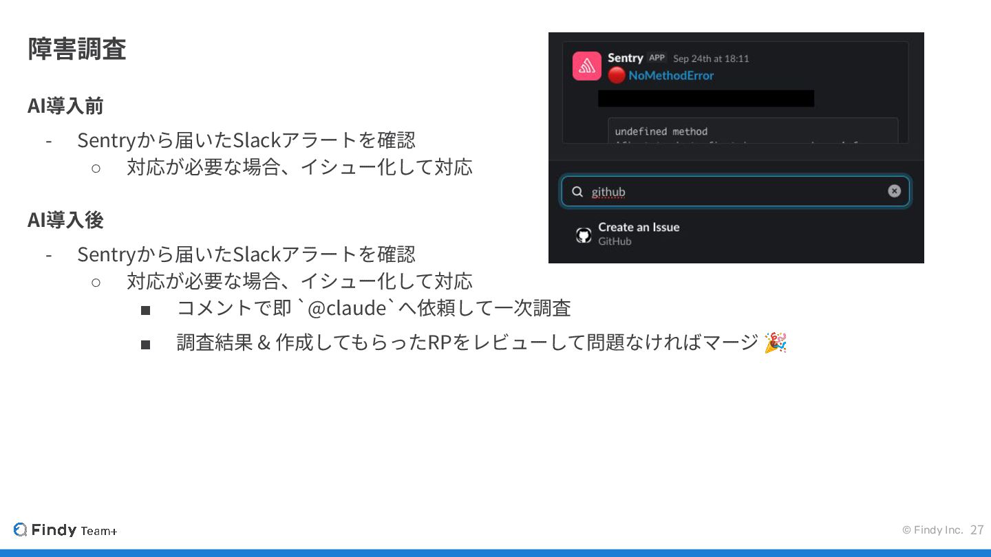 AI導⼊後 - Sentryから届いたSlackアラートを確認 ◦ 対応が必要な場合、イシュー化して対応 ▪ コメントで即 `@claude`へ依頼して⼀次調査 ▪ 調査結果 & 作成してもらったRPをレビューして問題なければマージ 🎉