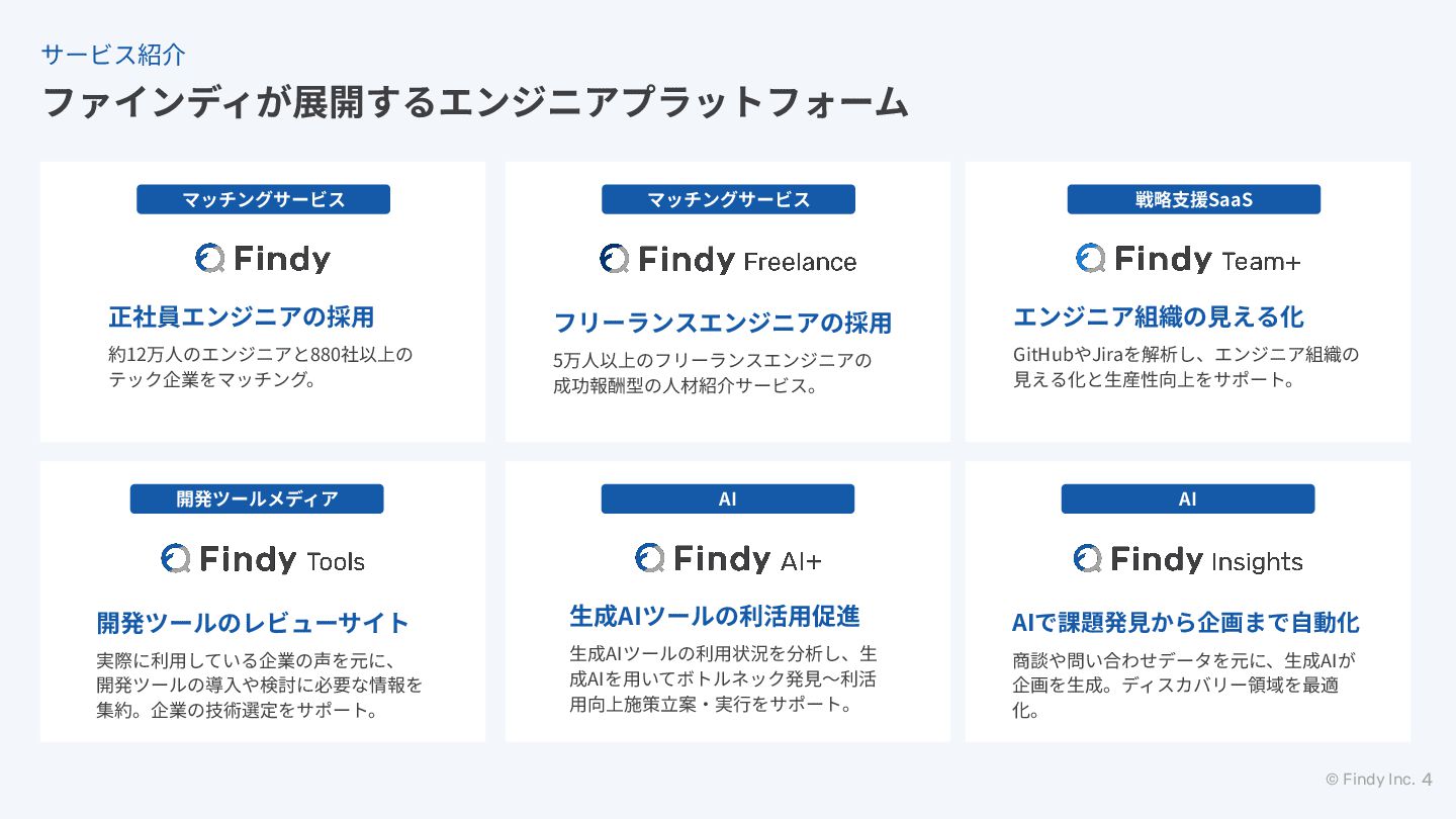 会社概要 会社名 ファインディ株式会社 / Findy Inc. 代表取締役 ⼭⽥ 裕⼀朗 設⽴ 2014 年 2 ⽉ ※ 本格的な事業開始は2016年7⽉ 社員数 354 名 資本⾦ 27億5,386 万円 ※ 資本準備⾦含む 住所 東京都品川区大崎1-2-2 アートヴィレッジ大崎セントラルタワー 5階 事業許可番号 13-ユ-308478 サービス ‧ スカウト型リクルーティングサービス「Findy」 ‧ ハイスキルな業務委託エンジニア紹介サービス「Findy Freelance」 ‧ 経営と開発現場をつなぐAI戦略⽀援SaaS「Findy Team+」 ‧ 開発ツールに特化したレビューサイト「Findy Tools」 投資家 グローバル‧ブレイン、ユナイテッド、SMBCベンチャーキャピタル、KDDI、JA三 井リース、みずほキャピタル、博報堂DYベンチャーズ、Carbide Ventures、等 3