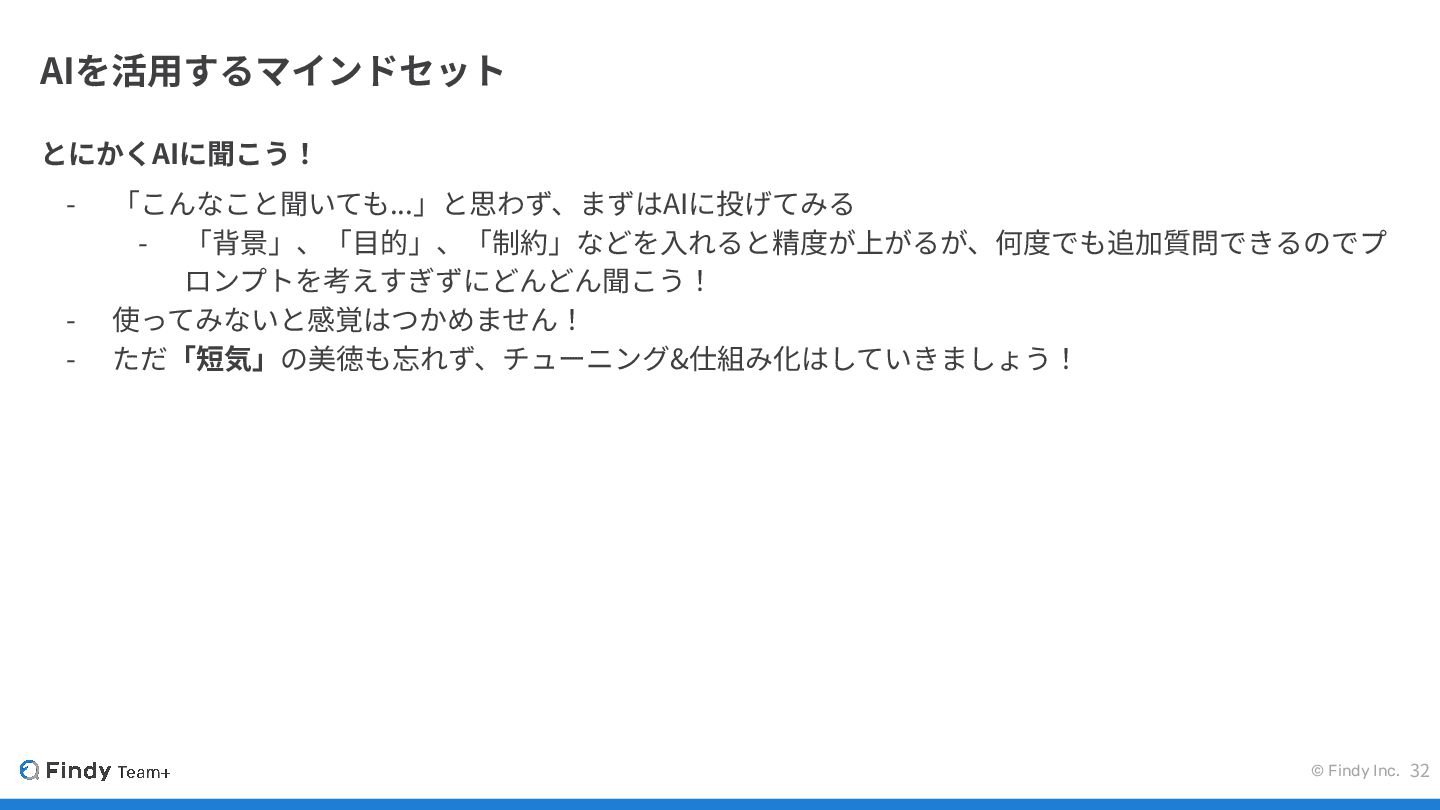 © Findy Inc. 32 AIを活⽤するマインドセット とにかくAIに聞こう! - 「こんなこと聞いても...」と思わず、まずはAIに投げてみる - 「背景」、「⽬的」、「制約」などを⼊れると精度が上がるが、何度でも追加質問できるのでプ