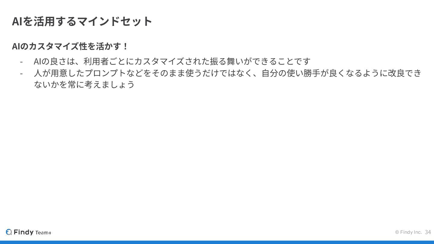 © Findy Inc. 34 AIを活⽤するマインドセット AIのカスタマイズ性を活かす! - AIの良さは、利⽤者ごとにカスタマイズされた振る舞いができることです - ⼈が⽤意したプロンプトなどをそのまま使うだけではなく、⾃分の使い勝⼿が良くなるように改良でき