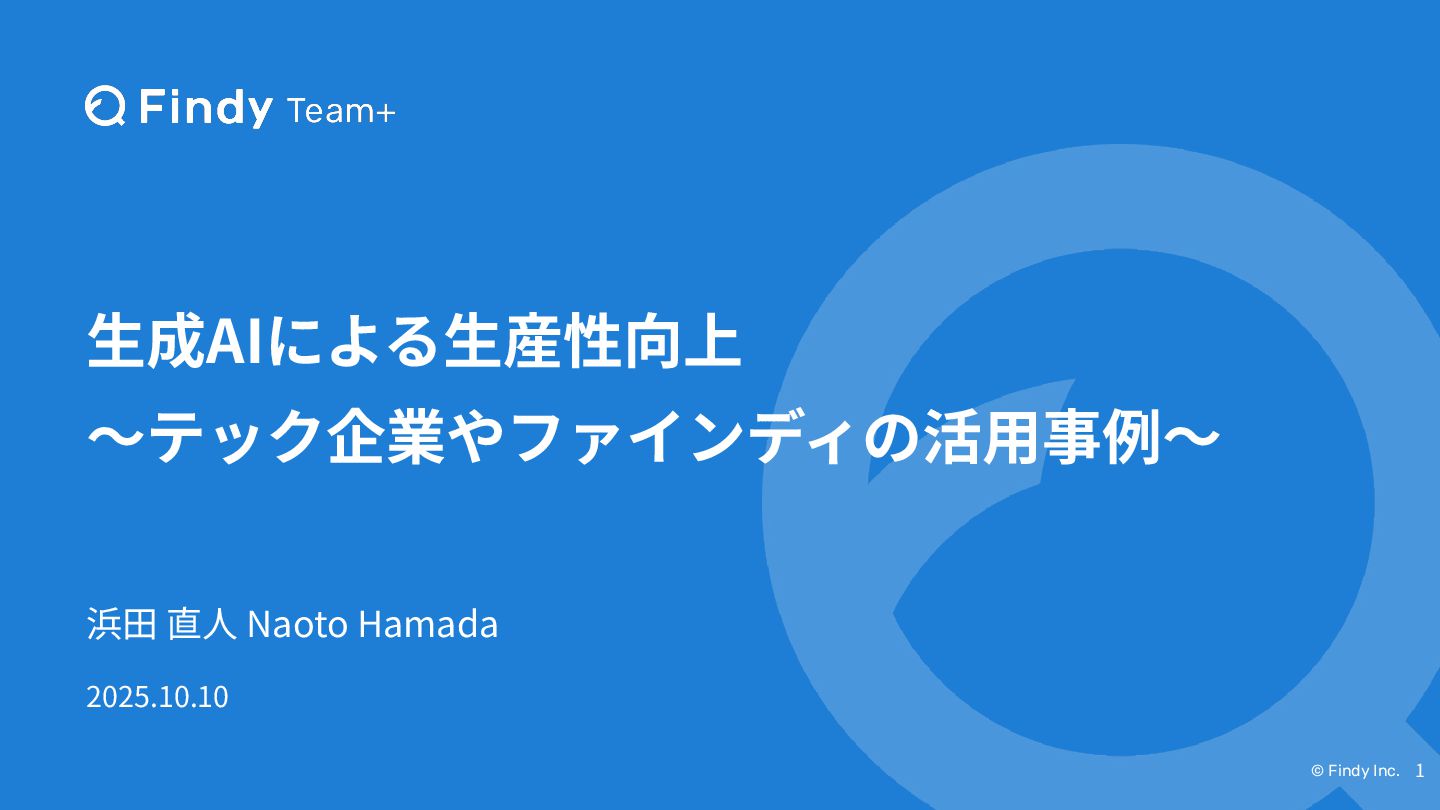 © Findy Inc. 1 ⽣成AIによる⽣産性向上 〜テック企業やファインディの活⽤事例〜 2025.10.10 浜⽥ 直⼈ Naoto