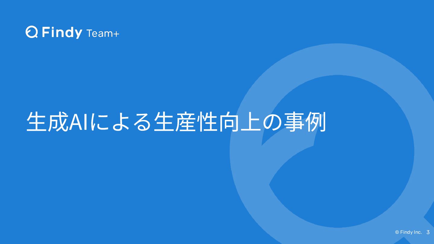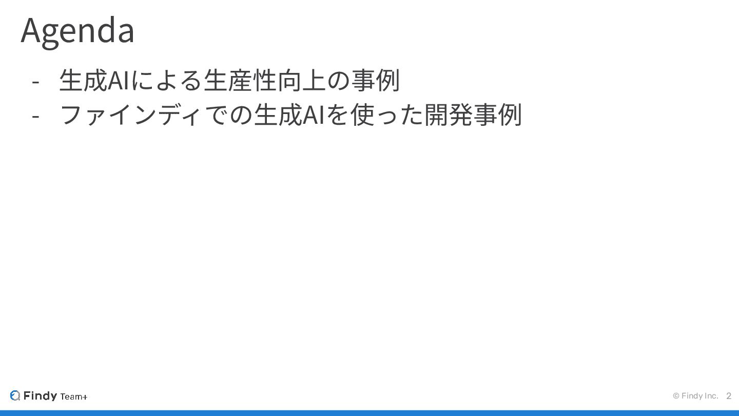 © Findy Inc. 2 Agenda - ⽣成AIによる⽣産性向上の事例 - ファインディでの⽣成AIを使った開発事例