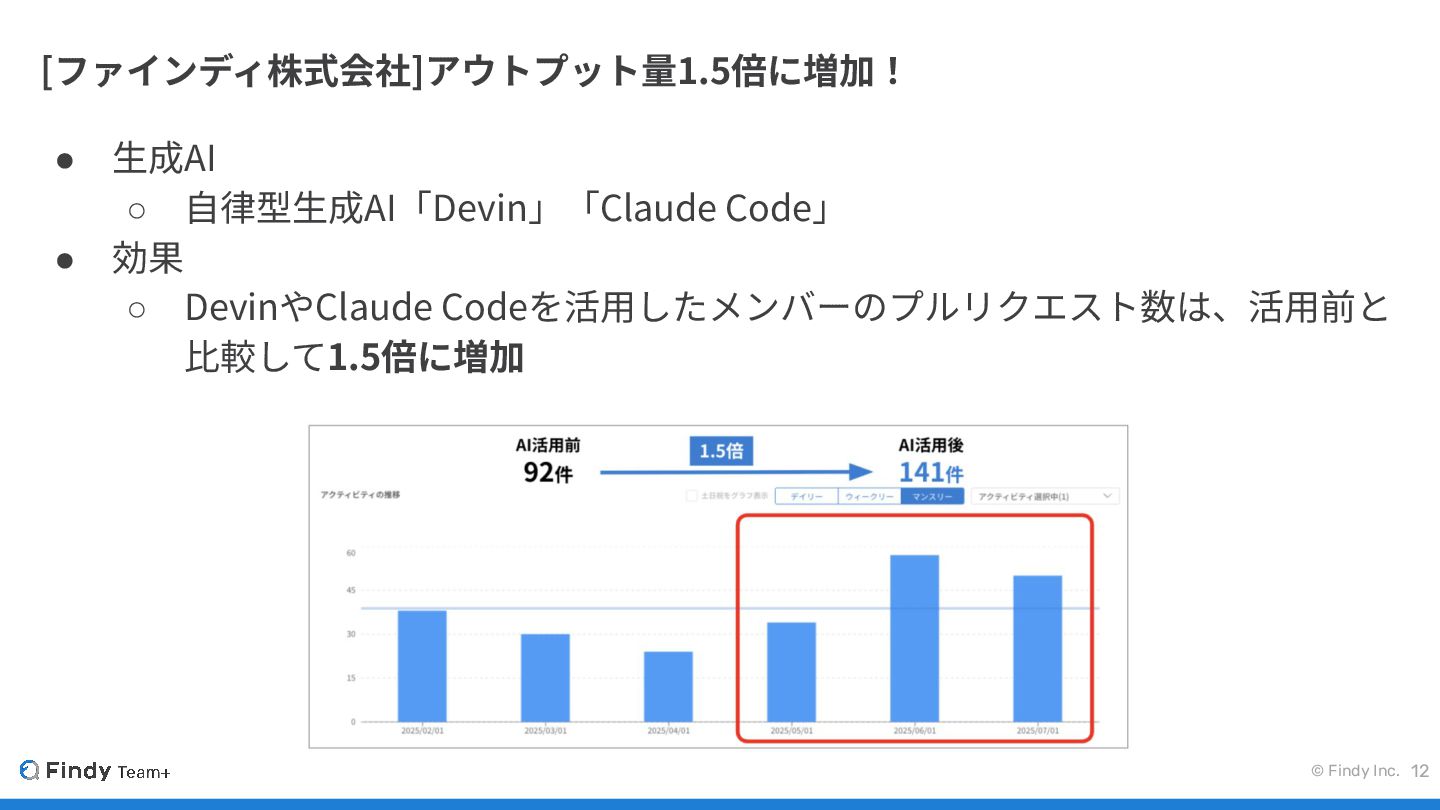 効果 ◦ DevinやClaude Codeを活⽤したメンバーのプルリクエスト数は、活⽤前と ⽐較して1.5倍に増加 [ファインディ株式会社]アウトプット量1.5倍に増加!