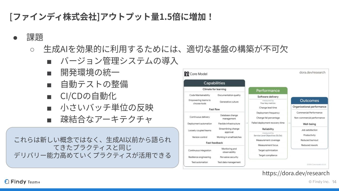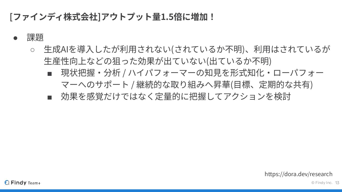現状把握‧分析 / ハイパフォーマーの知⾒を形式知化‧ローパフォー マーへのサポート / 継続的な取り組みへ昇華(⽬標、定期的な共有) ▪ 効果を感覚だけではなく定量的に把握してアクションを検討 [ファインディ株式会社]アウトプット量1.5倍に増加! https://dora.dev/research