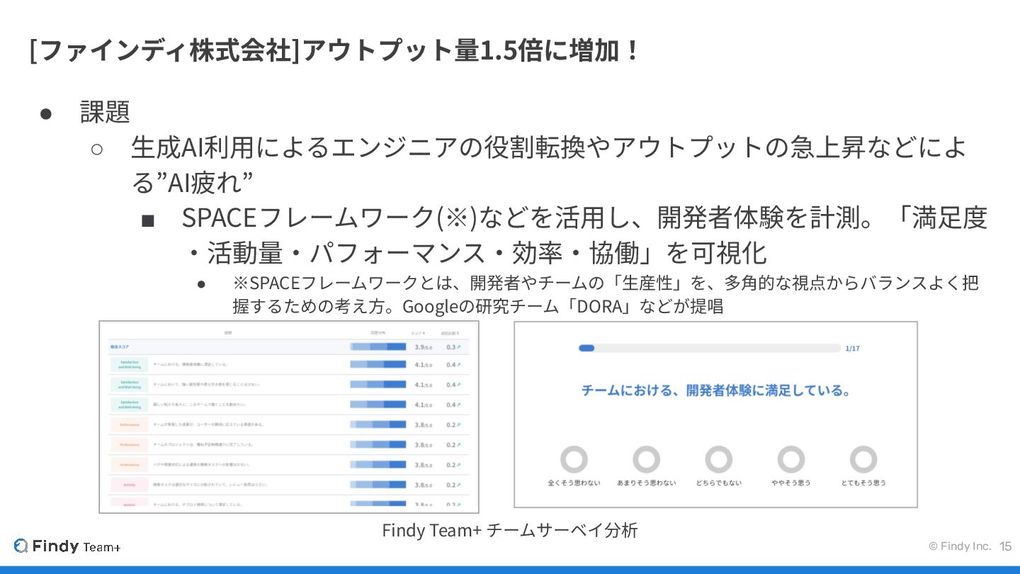 SPACEフレームワーク(※)などを活⽤し、開発者体験を計測。「満⾜度 ‧活動量‧パフォーマンス‧効率‧協働」を可視化 • ※SPACEフレームワークとは、開発者やチームの「⽣産性」を、多⾓的な視点からバランスよく把 握するための考え⽅。Googleの研究チーム「DORA」などが提唱 [ファインディ株式会社]アウトプット量1.5倍に増加! Findy Team+ チームサーベイ分析