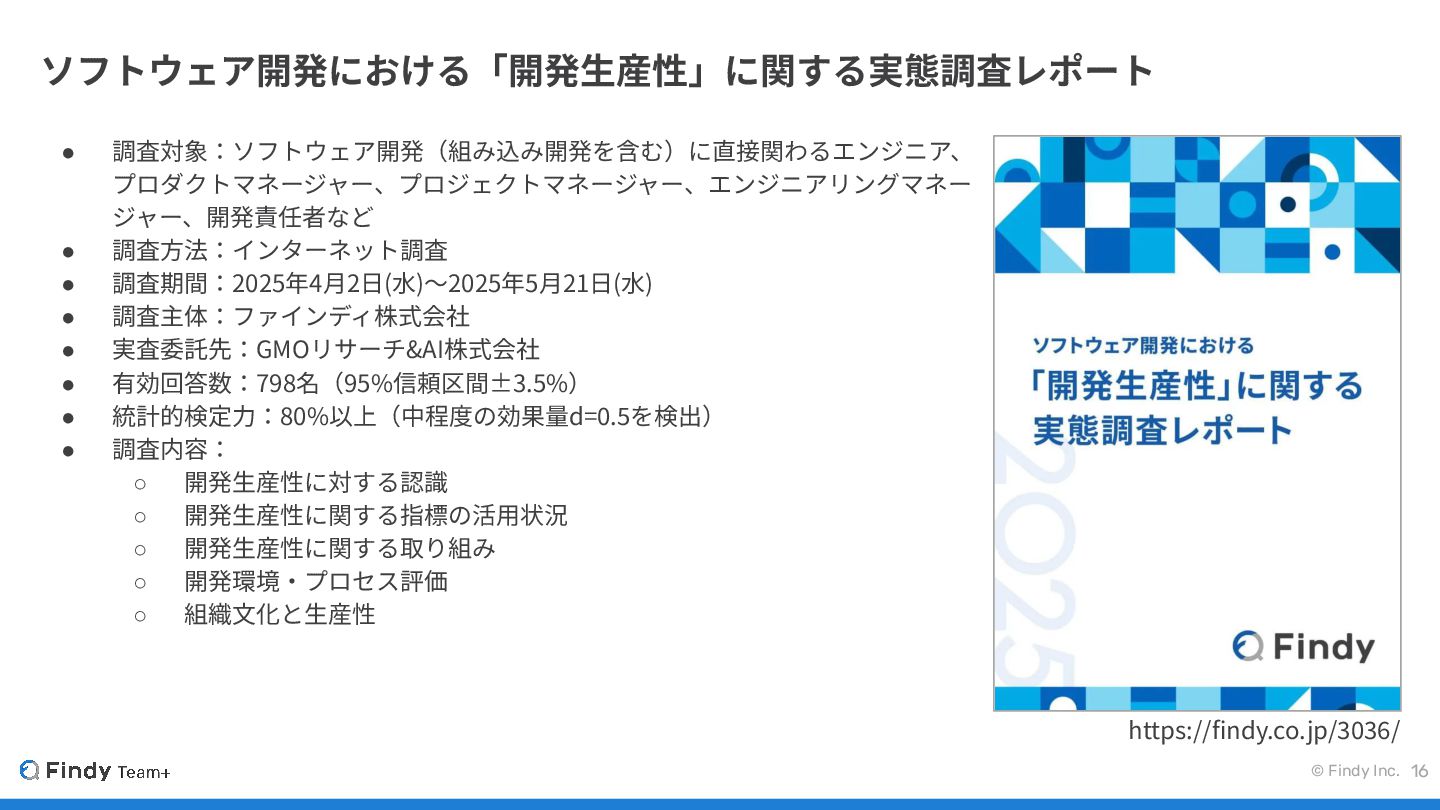• 調査⽅法:インターネット調査 • 調査期間:2025年4⽉2⽇(⽔)〜2025年5⽉21⽇(⽔) • 調査主体:ファインディ株式会社 • 実査委託先:GMOリサーチ&AI株式会社 • 有効回答数:798名(95%信頼区間±3.5%) • 統計的検定⼒:80%以上(中程度の効果量d=0.5を検出) • 調査内容: ◦ 開発⽣産性に対する認識 ◦ 開発⽣産性に関する指標の活⽤状況 ◦ 開発⽣産性に関する取り組み ◦ 開発環境‧プロセス評価 ◦ 組織⽂化と⽣産性