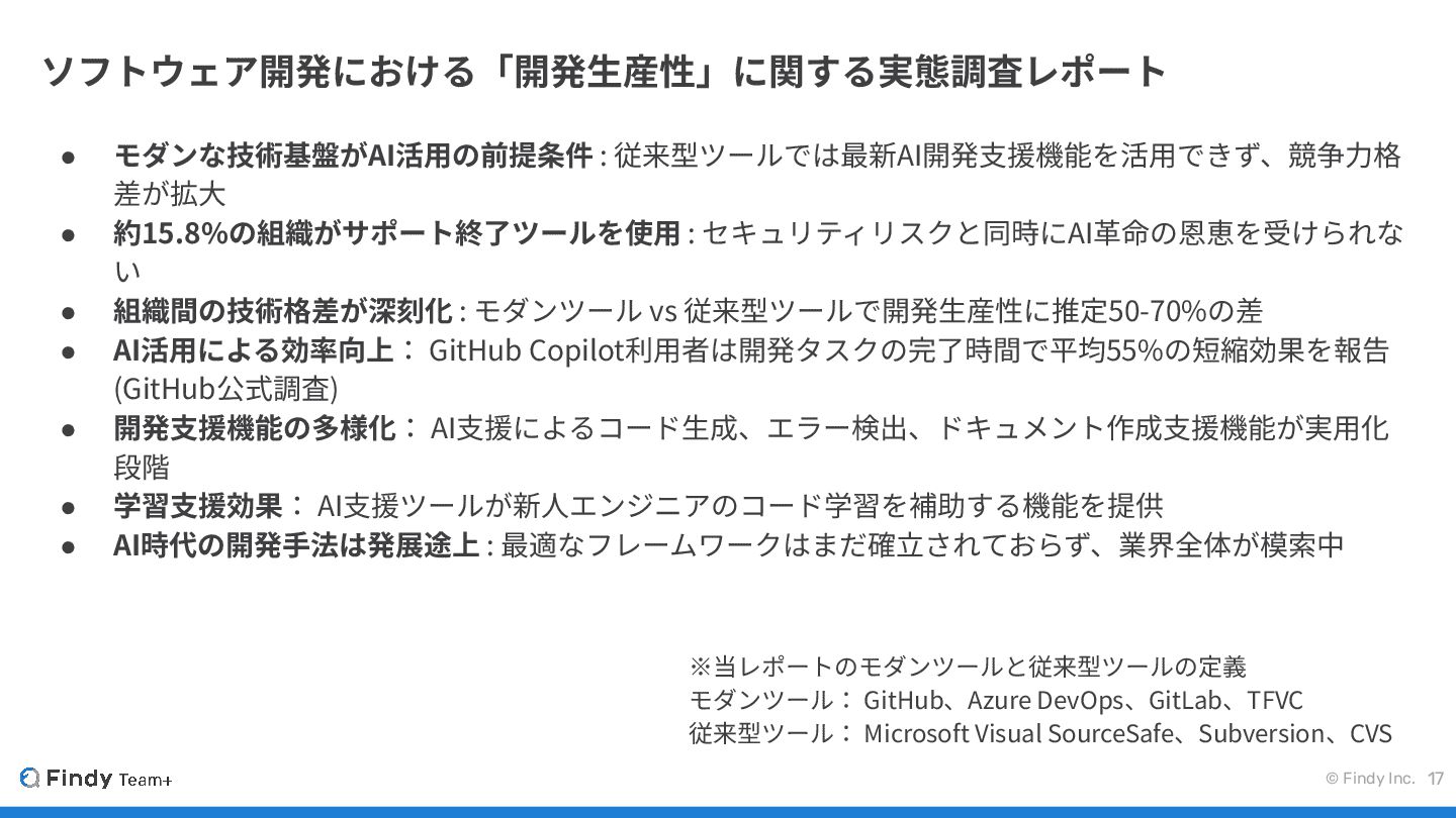 約15.8%の組織がサポート終了ツールを使⽤ : セキュリティリスクと同時にAI⾰命の恩恵を受けられな い • 組織間の技術格差が深刻化 : モダンツール vs 従来型ツールで開発⽣産性に推定50-70%の差 • AI活⽤による効率向上: GitHub Copilot利⽤者は開発タスクの完了時間で平均55%の短縮効果を報告 (GitHub公式調査) • 開発⽀援機能の多様化: AI⽀援によるコード⽣成、エラー検出、ドキュメント作成⽀援機能が実⽤化 段階 • 学習⽀援効果: AI⽀援ツールが新⼈エンジニアのコード学習を補助する機能を提供 • AI時代の開発⼿法は発展途上 : 最適なフレームワークはまだ確⽴されておらず、業界全体が模索中 ソフトウェア開発における「開発⽣産性」に関する実態調査レポート ※当レポートのモダンツールと従来型ツールの定義 モダンツール: GitHub、Azure DevOps、GitLab、TFVC 従来型ツール: Microsoft Visual SourceSafe、Subversion、CVS
