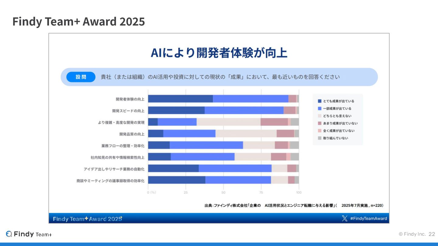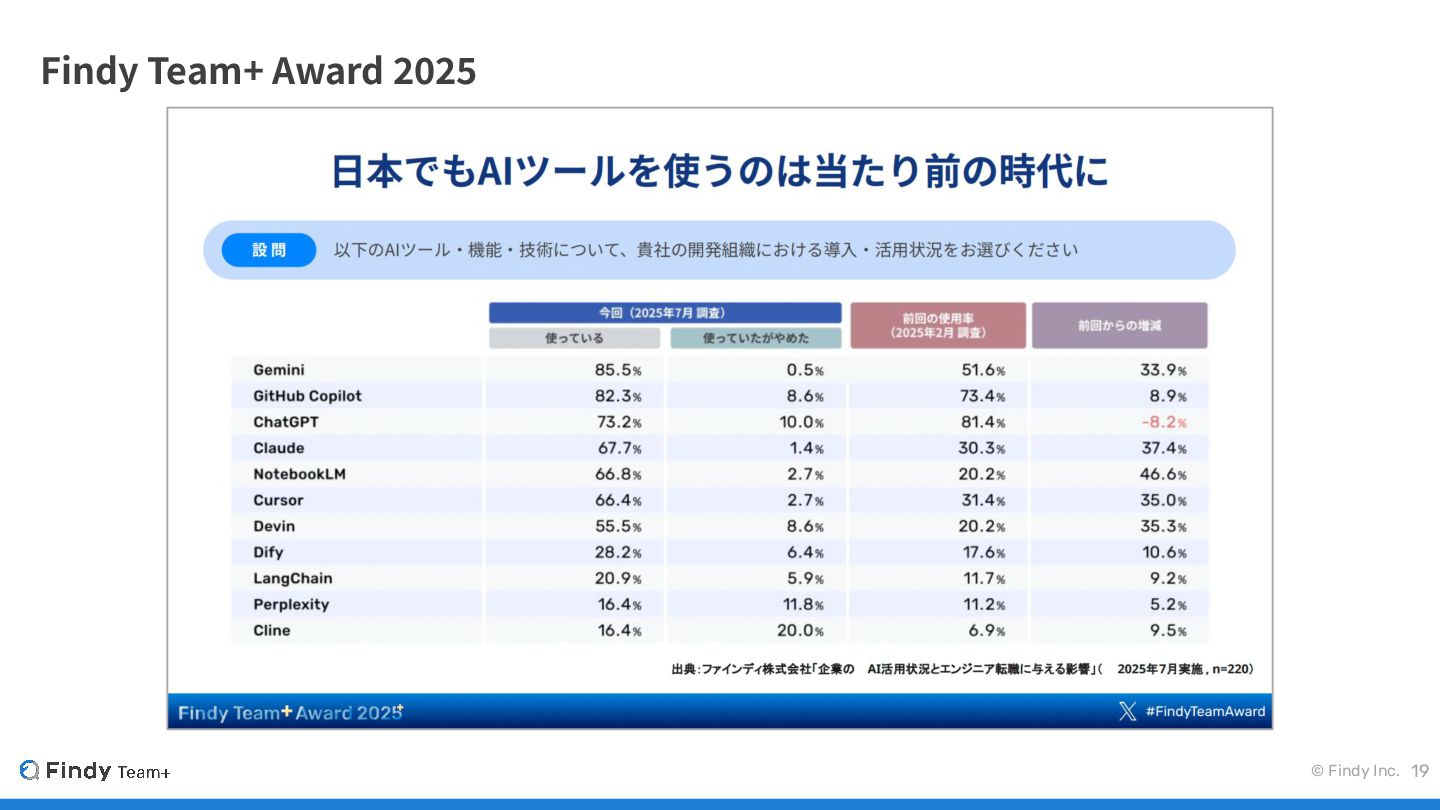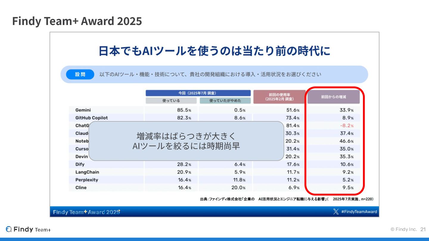 © Findy Inc. 21 Findy Team+ Award 2025 増減率はばらつきが⼤きく AIツールを絞るには時期尚早