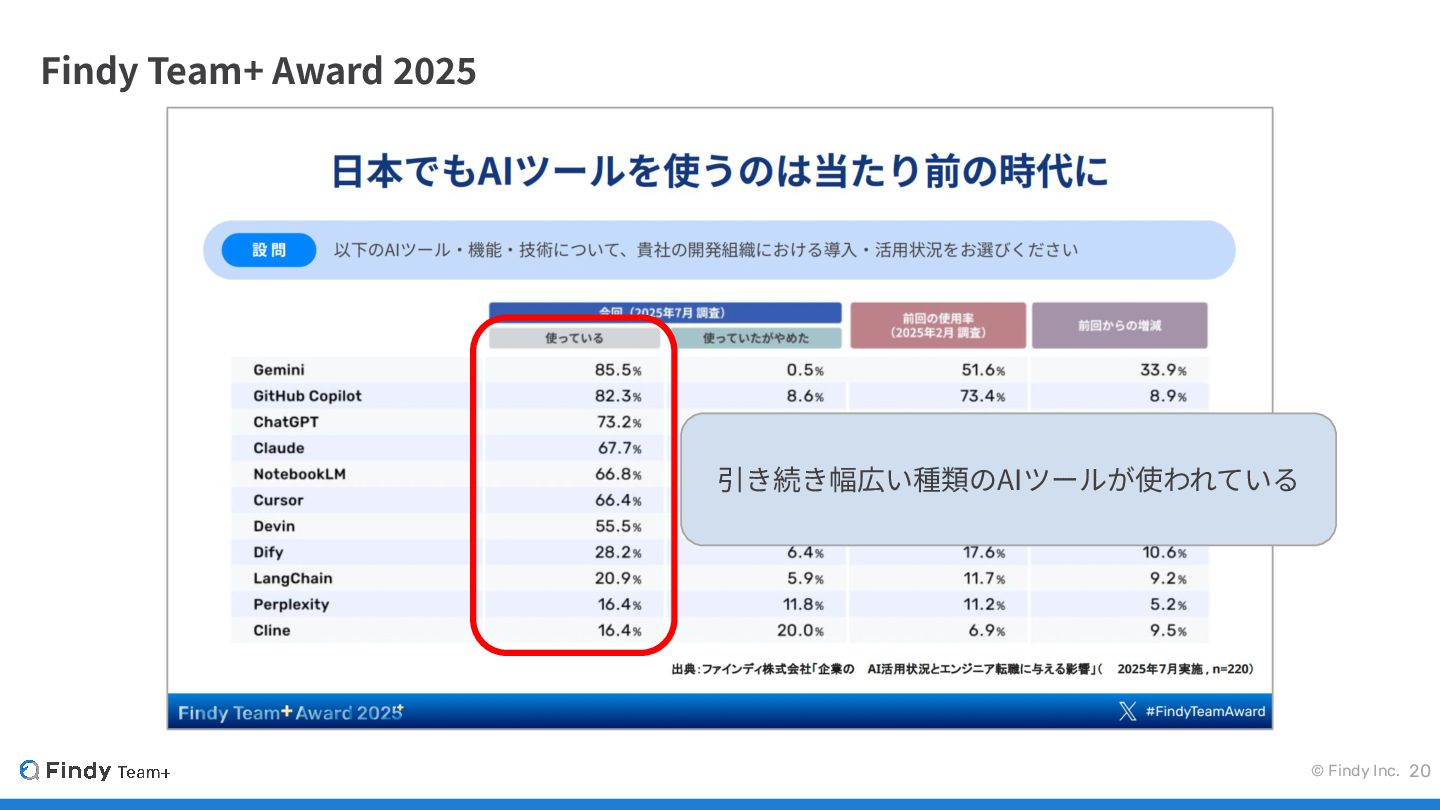 © Findy Inc. 20 Findy Team+ Award 2025 引き続き幅広い種類のAIツールが使われている