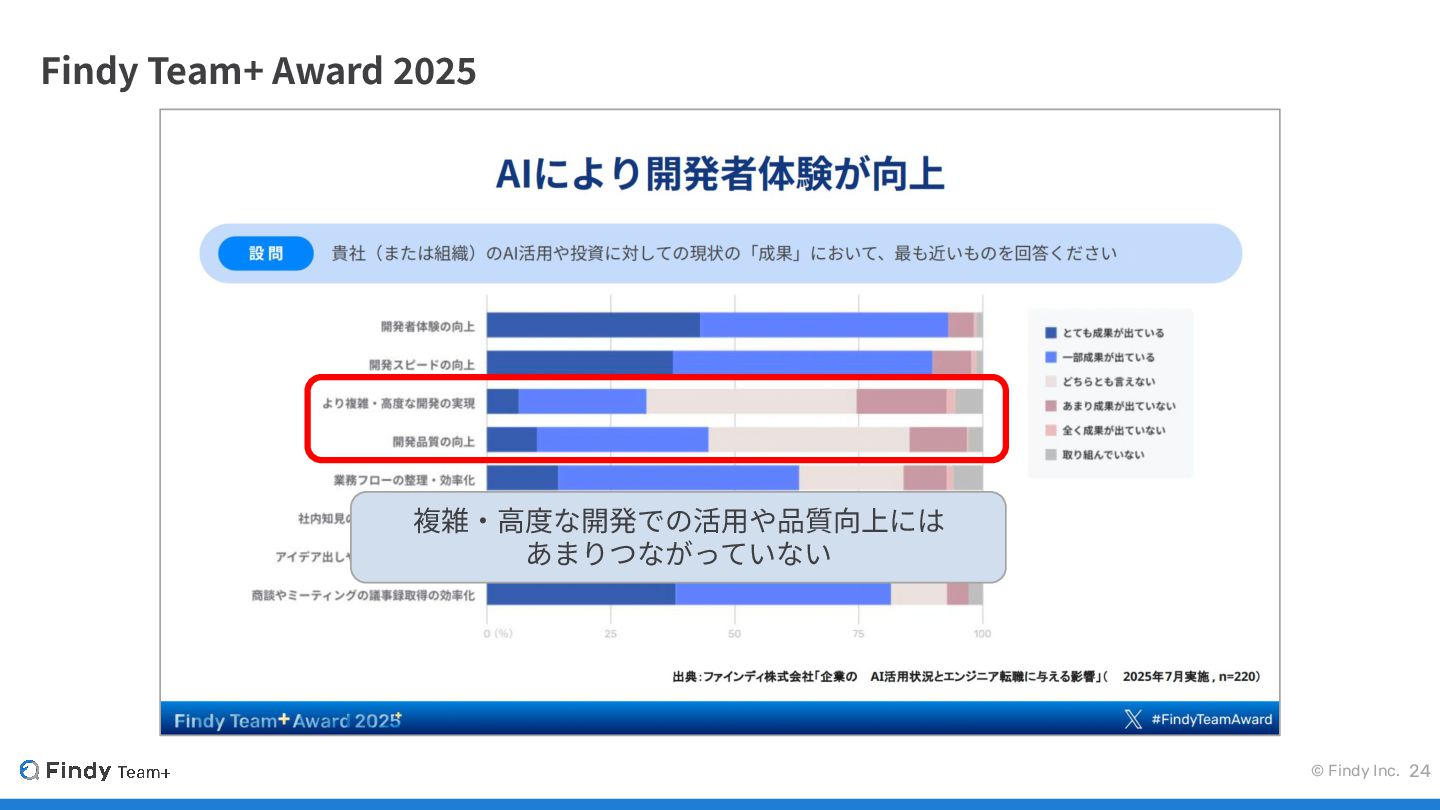 © Findy Inc. 24 Findy Team+ Award 2025 複雑‧⾼度な開発での活⽤や品質向上には あまりつながっていない