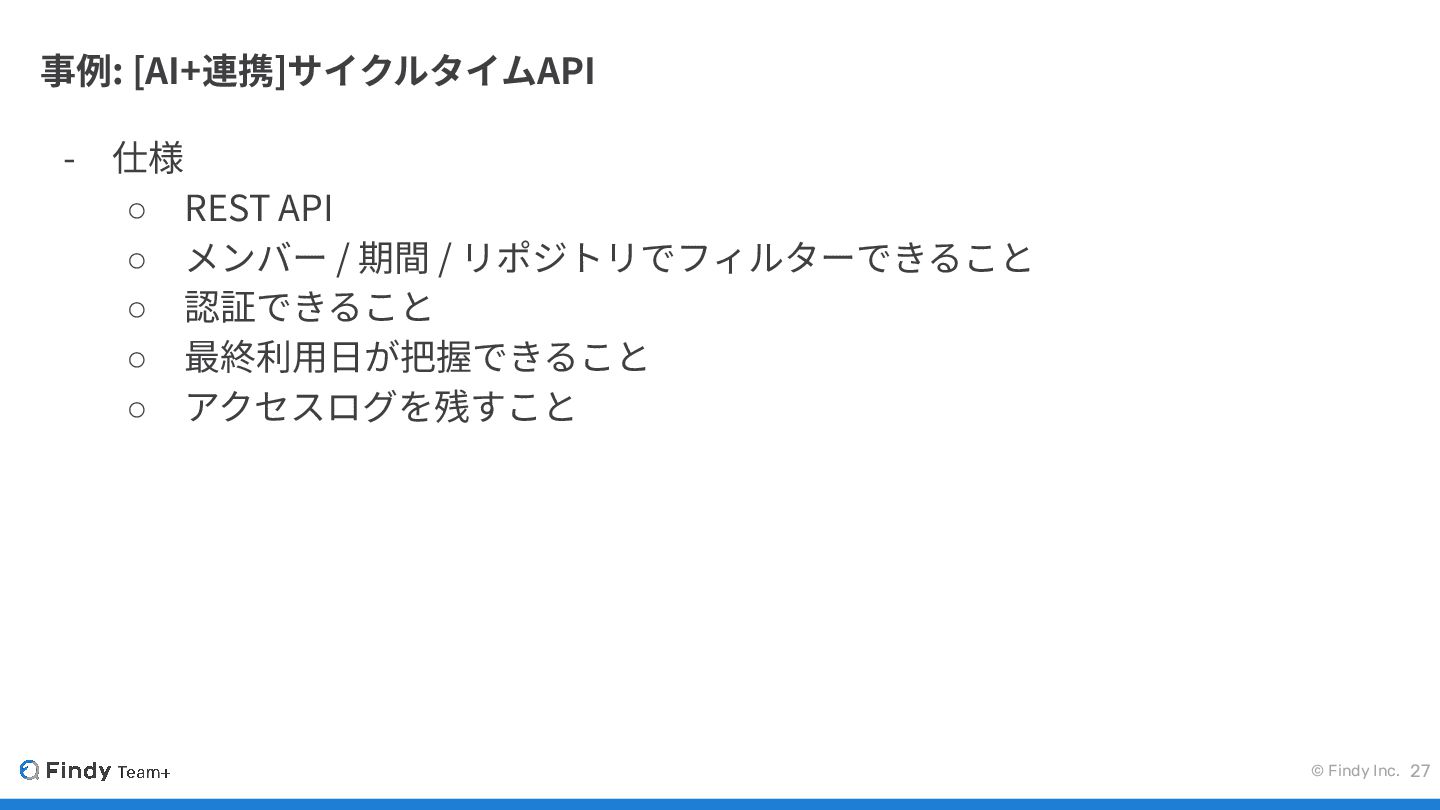 メンバー / 期間 / リポジトリでフィルターできること ◦ 認証できること ◦ 最終利⽤⽇が把握できること ◦ アクセスログを残すこと 事例: [AI+連携]サイクルタイムAPI