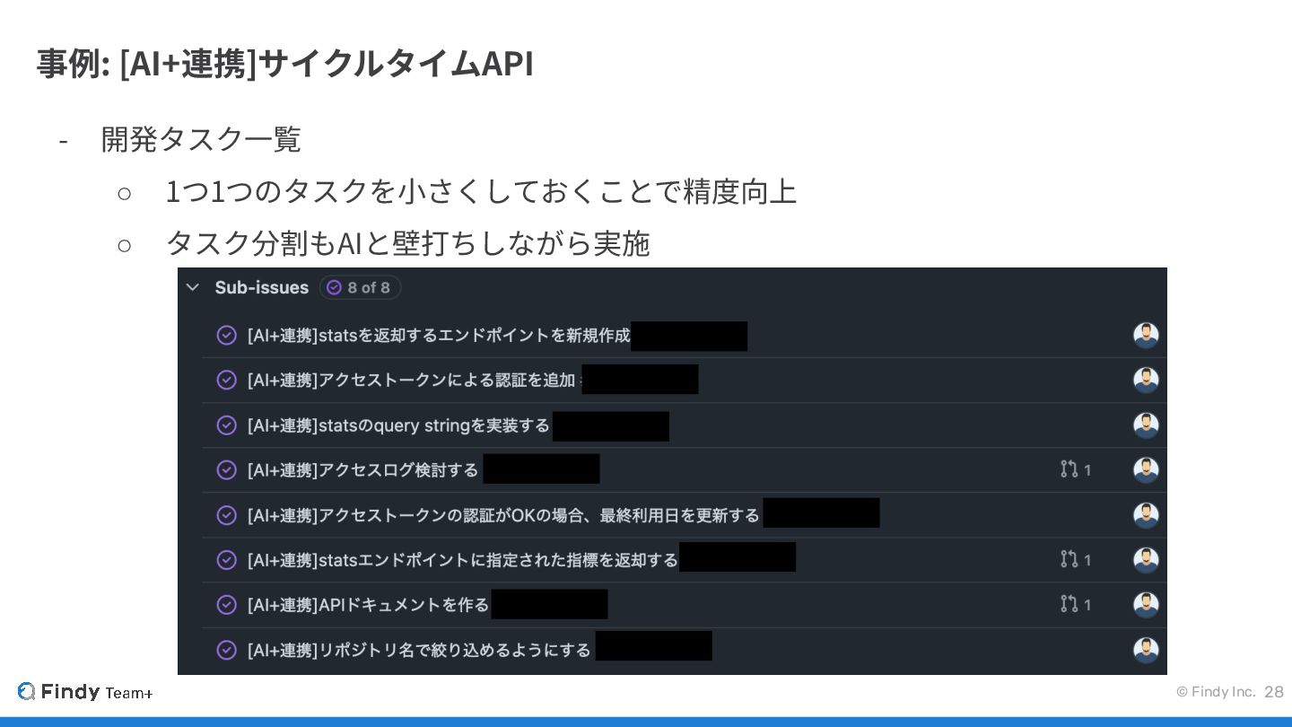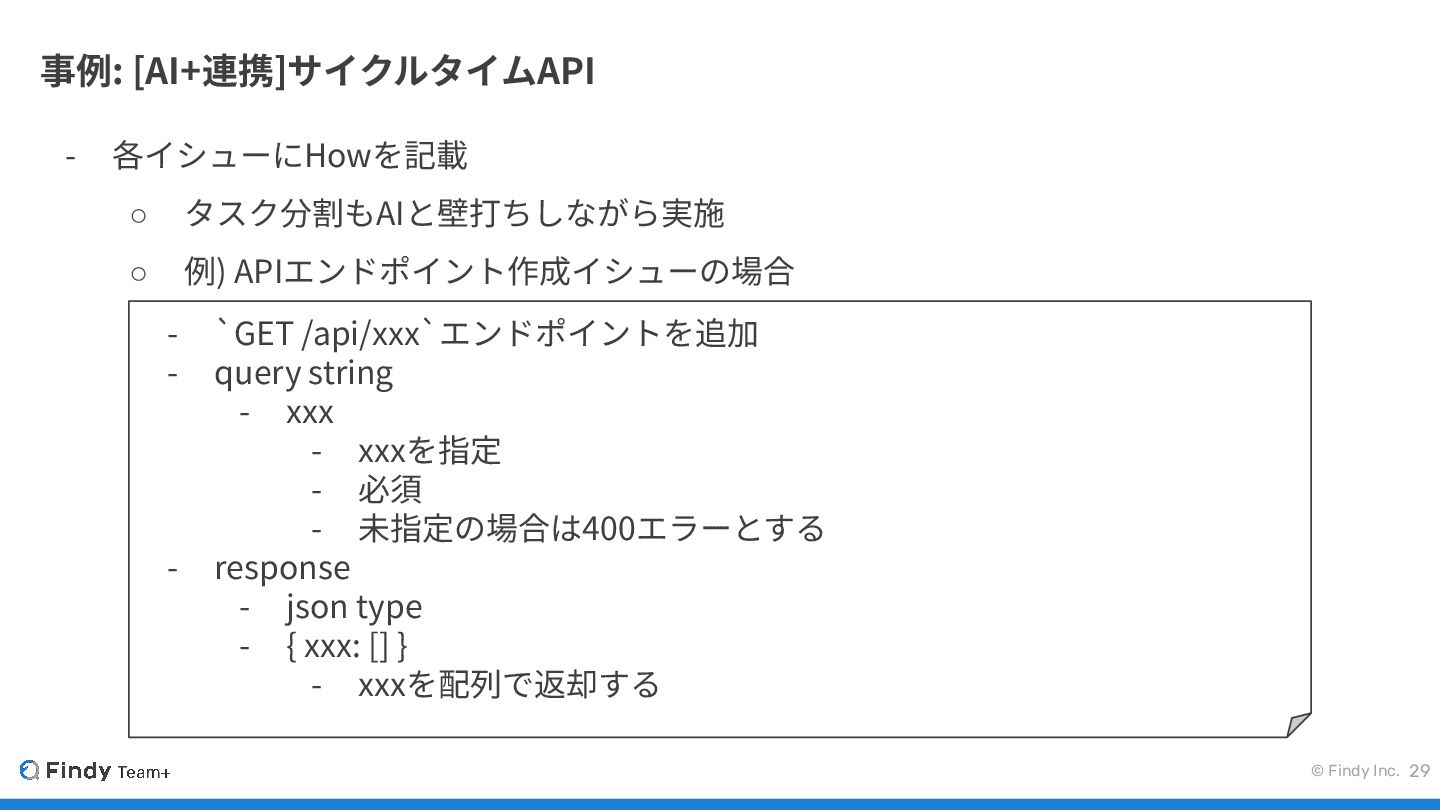 © Findy Inc. 29 事例: [AI+連携]サイクルタイムAPI - 各イシューにHowを記載 ◦ タスク分割もAIと壁打ちしながら実施