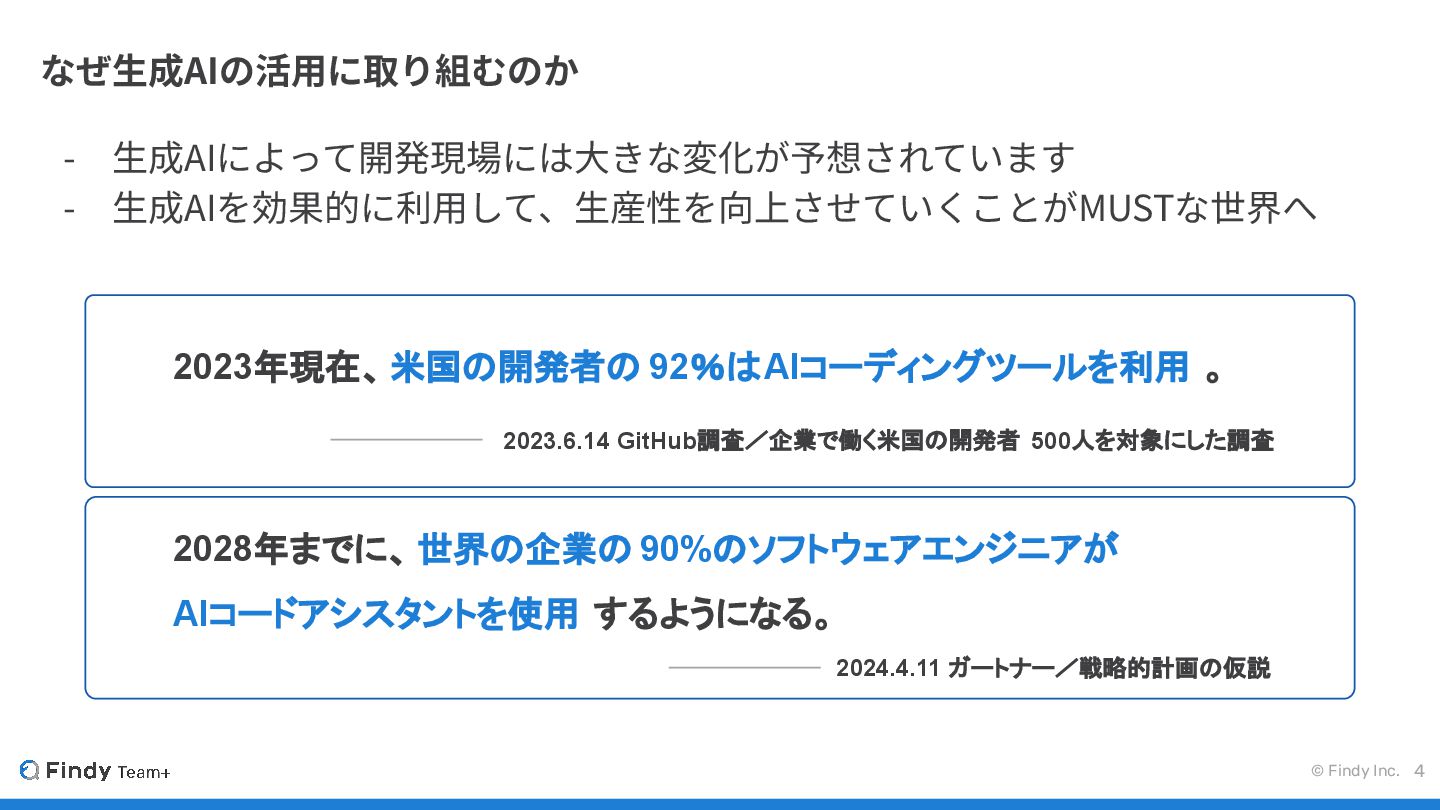 © Findy Inc. 4 なぜ⽣成AIの活⽤に取り組むのか - ⽣成AIによって開発現場には⼤きな変化が予想されています - ⽣成AIを効果的に利⽤して、⽣産性を向上させていくことがMUSTな世界へ 2023年現在、米国の開発者の