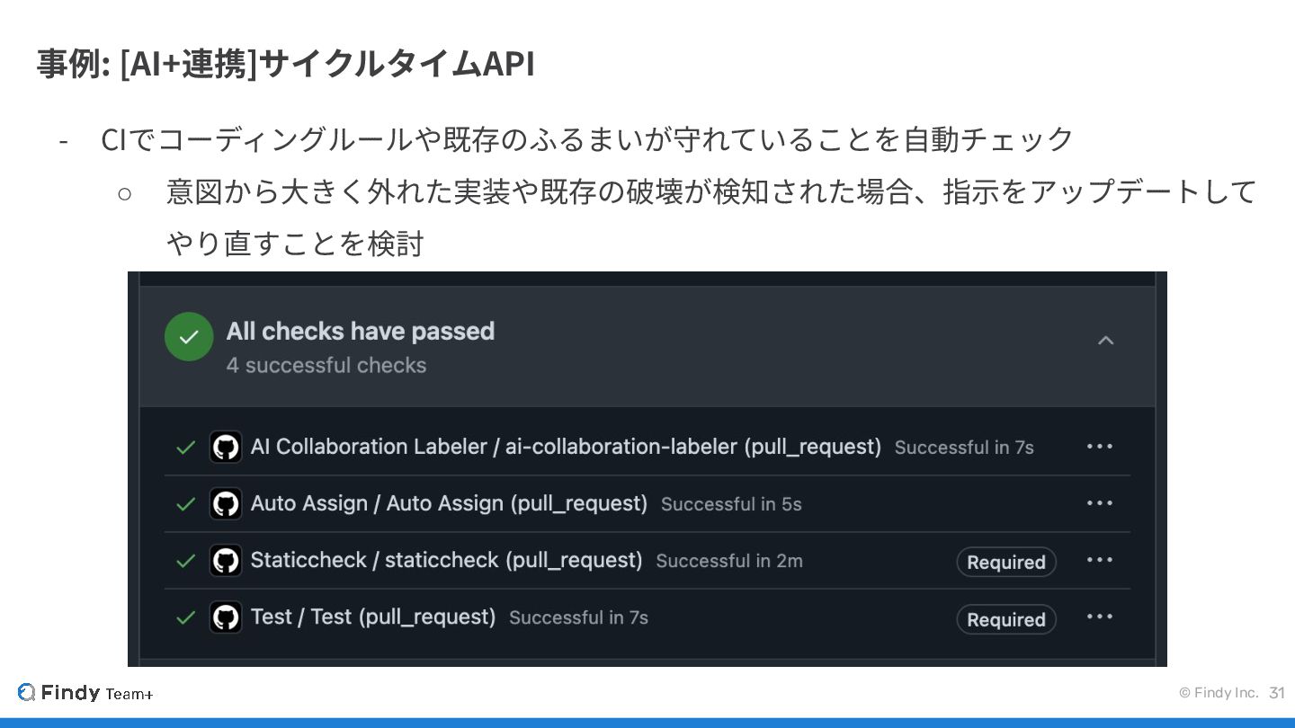 © Findy Inc. 31 事例: [AI+連携]サイクルタイムAPI - CIでコーディングルールや既存のふるまいが守れていることを⾃動チェック ◦ 意図から⼤きく外れた実装や既存の破壊が検知された場合、指⽰をアップデートして