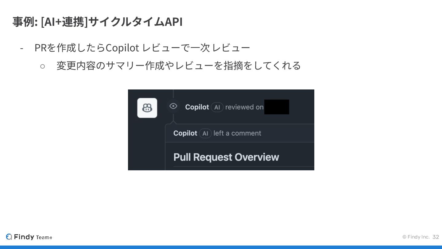 © Findy Inc. - PRを作成したらCopilot レビューで⼀次レビュー ◦ 変更内容のサマリー作成やレビューを指摘をしてくれる 32 事例: