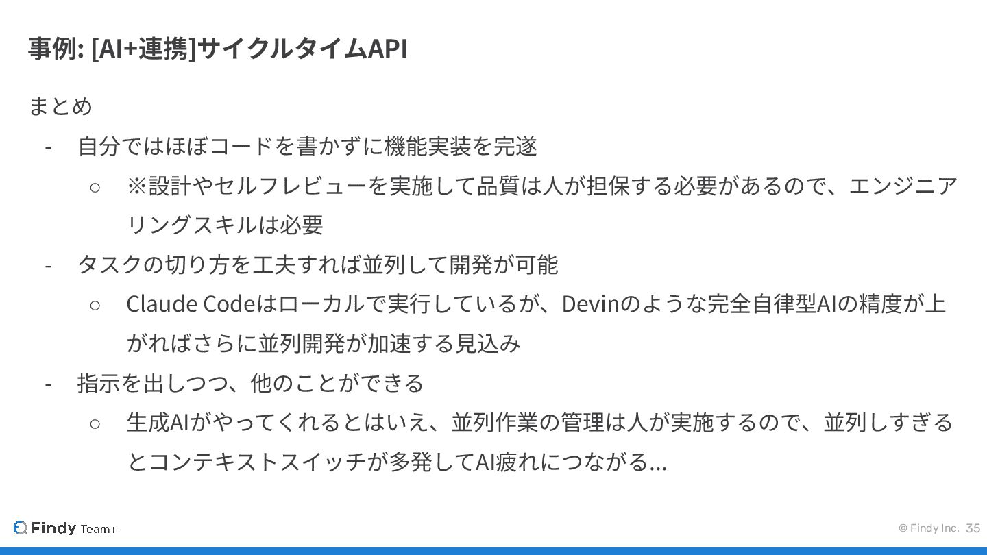 © Findy Inc. 35 事例: [AI+連携]サイクルタイムAPI まとめ - ⾃分ではほぼコードを書かずに機能実装を完遂 ◦