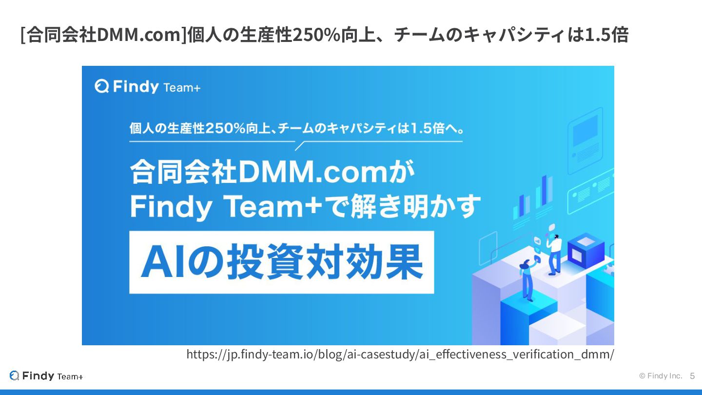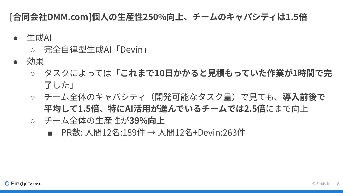 © Findy Inc. 5 [合同会社DMM.com]個⼈の⽣産性250%向上、チームのキャパシティは1.5倍 https://jp.findy-team.io/blog/ai-casestudy/ai_effectiveness_verification_dmm/