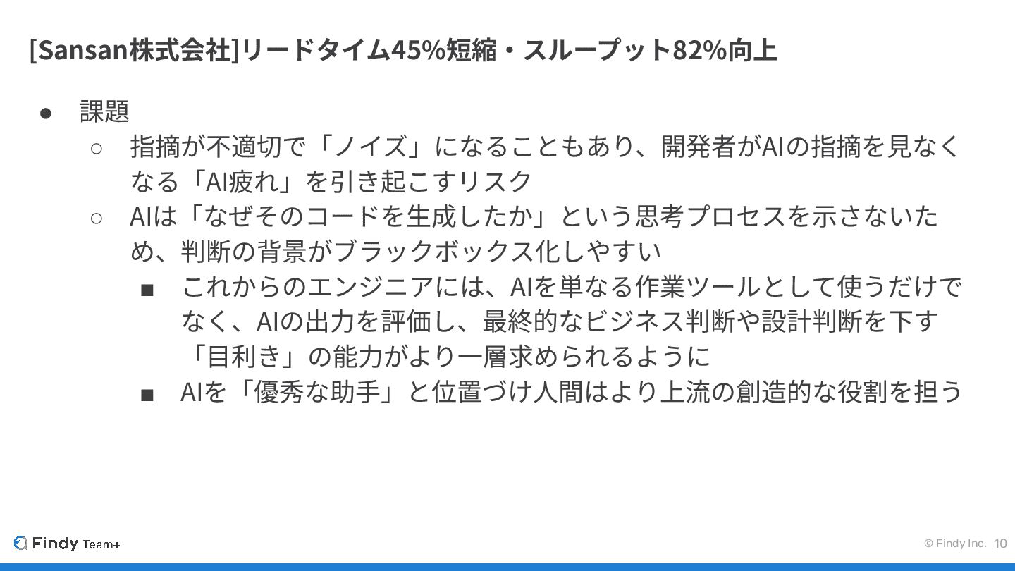 AIは「なぜそのコードを⽣成したか」という思考プロセスを⽰さないた め、判断の背景がブラックボックス化しやすい ▪ これからのエンジニアには、AIを単なる作業ツールとして使うだけで なく、AIの出⼒を評価し、最終的なビジネス判断や設計判断を下す 「⽬利き」の能⼒がより⼀層求められるように ▪ AIを「優秀な助⼿」と位置づけ⼈間はより上流の創造的な役割を担う [Sansan株式会社]リードタイム45%短縮‧スループット82%向上