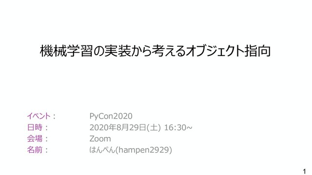 1 機械学習の実装から考えるオブジェクト指向 イベント︓ PyCon2020 ⽇時︓ 2020年8⽉29⽇(⼟) 16:30~ 会場︓ Zoom 名前︓