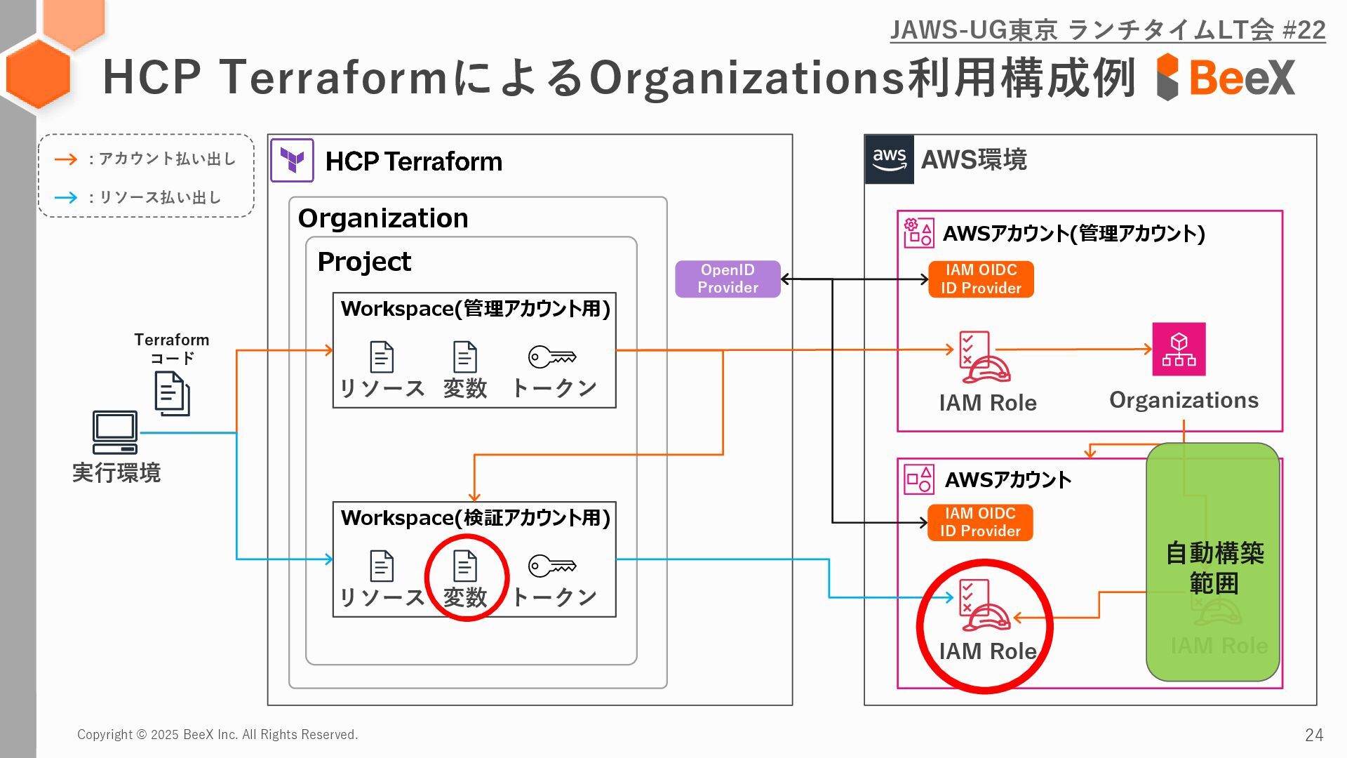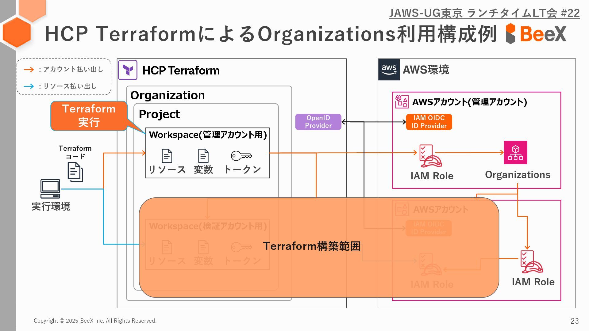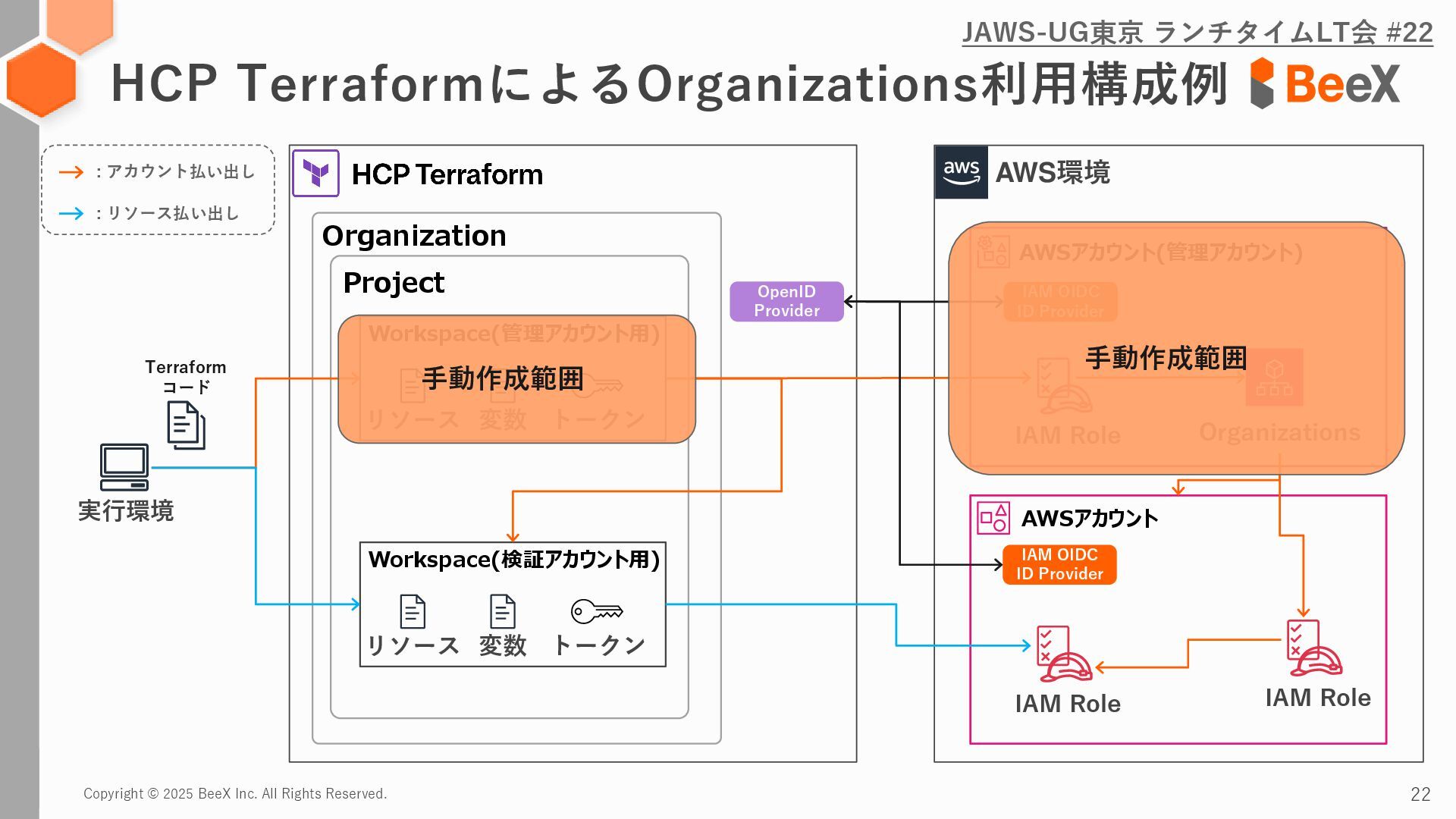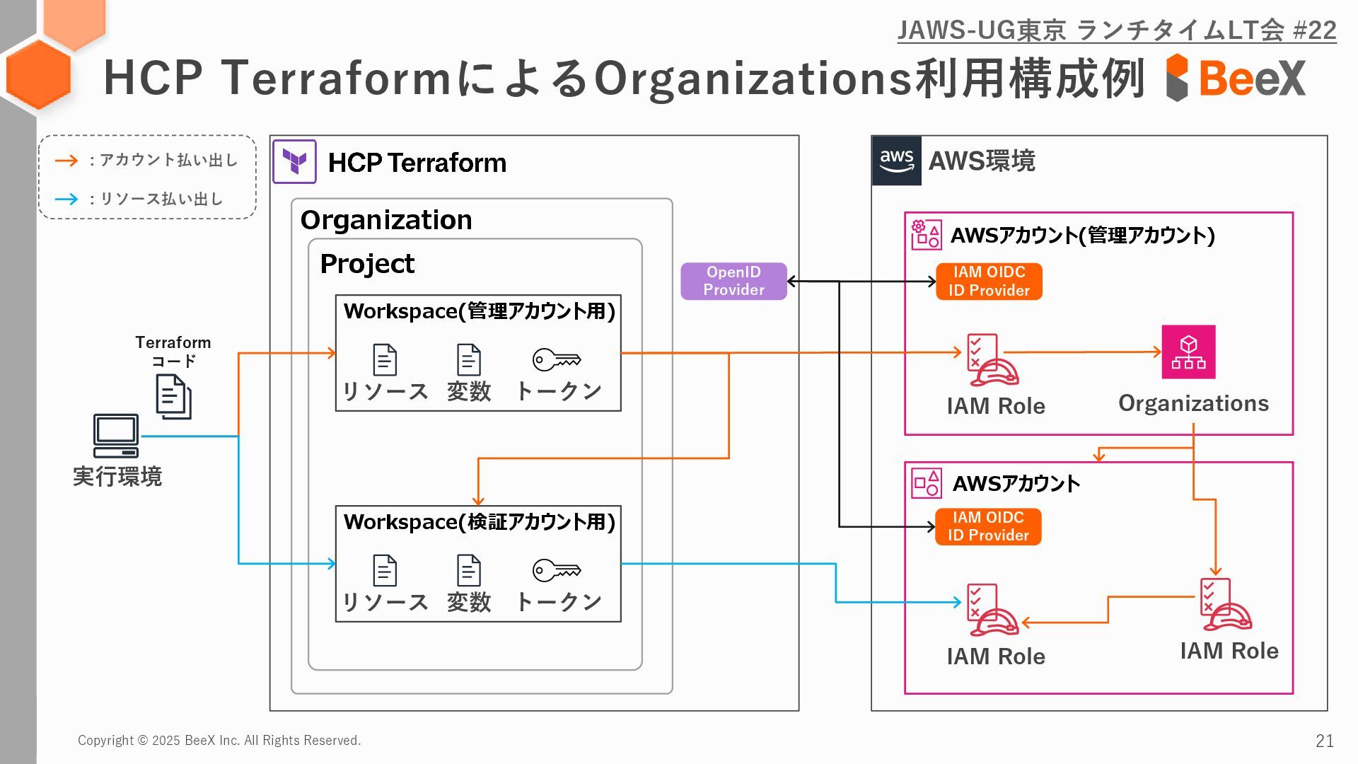 TerraformによるOrganizations利用構成例 実行環境 Organization Project Workspace(管理アカウント用) リソース 変数 トークン Workspace(検証アカウント用) リソース 変数 トークン AWS環境 Organizations IAM Role IAM OIDC ID Provider OpenID Provider IAM Role IAM OIDC ID Provider IAM Role : アカウント払い出し : リソース払い出し 自動構築 範囲 Terraform コード AWSアカウント AWSアカウント(管理アカウント) JAWS-UG東京 ランチタイムLT会 #22