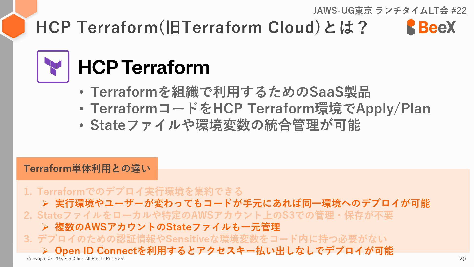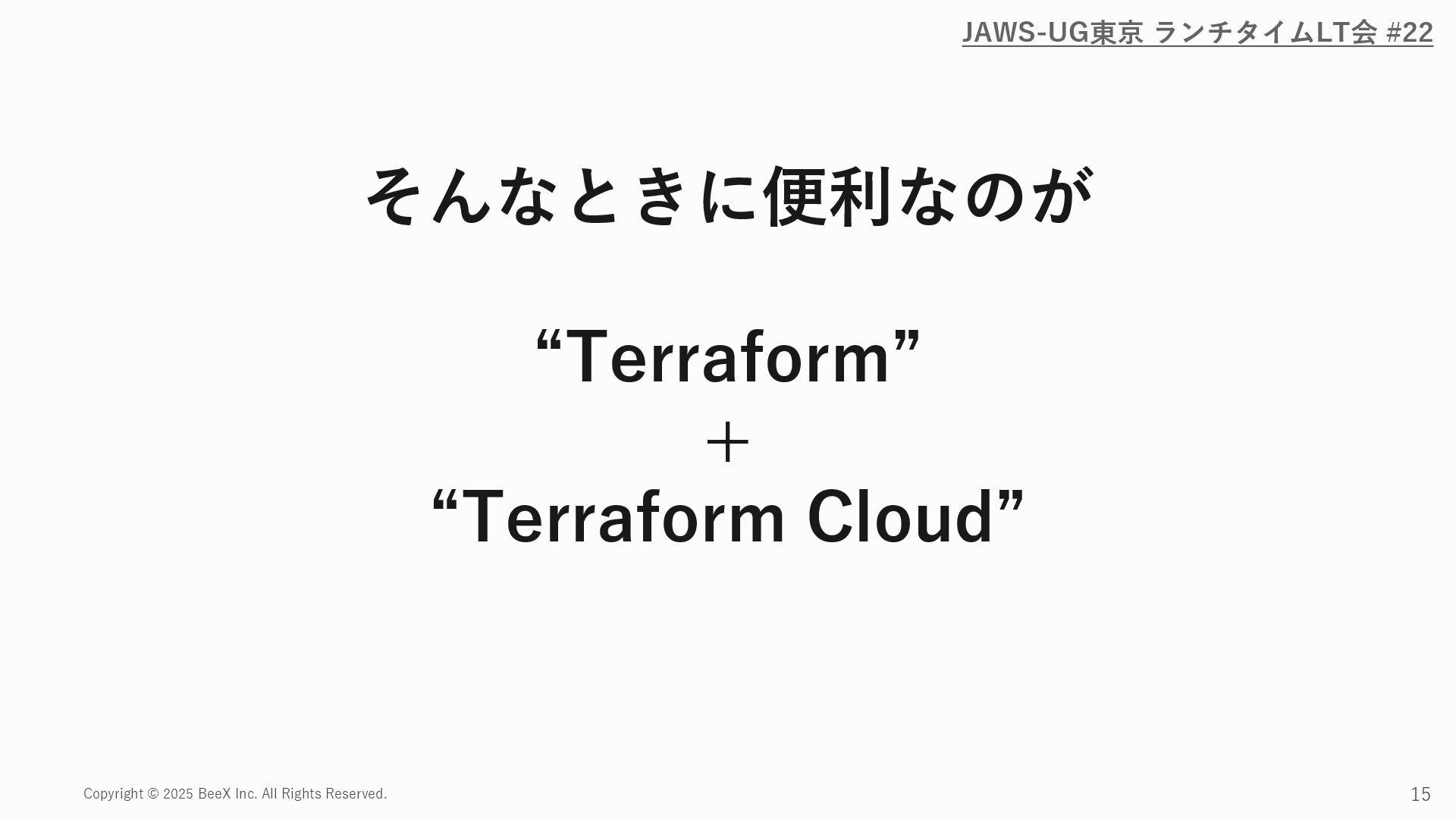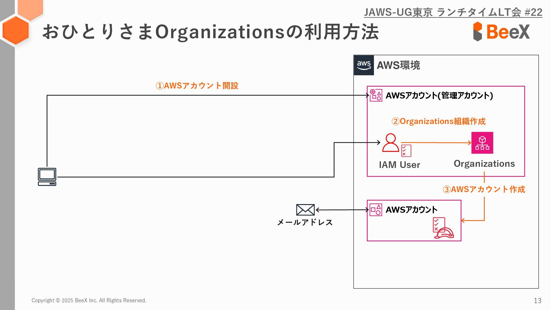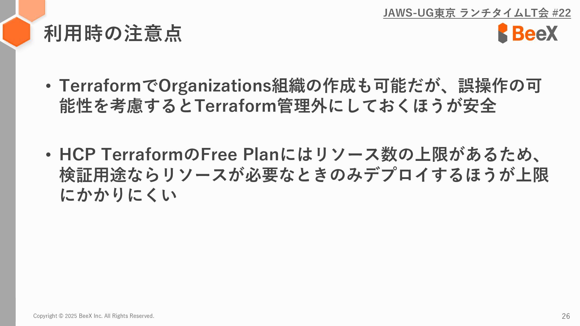 TerraformによるOrganizations利用構成例 実行環境 Organization Project Workspace(管理アカウント用) リソース 変数 トークン Workspace(検証アカウント用) リソース 変数 トークン AWS環境 Organizations IAM Role IAM OIDC ID Provider OpenID Provider IAM Role IAM OIDC ID Provider IAM Role : アカウント払い出し : リソース払い出し 自動構築 範囲 Terraform コード AWSアカウント AWSアカウント(管理アカウント) JAWS-UG東京 ランチタイムLT会 #22