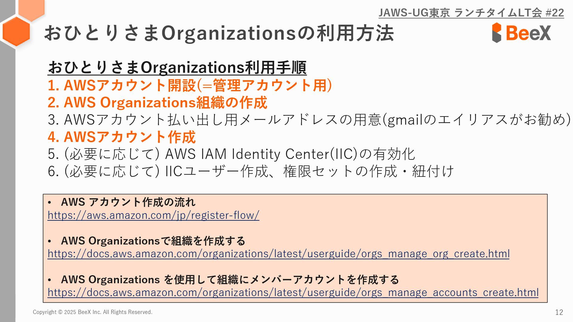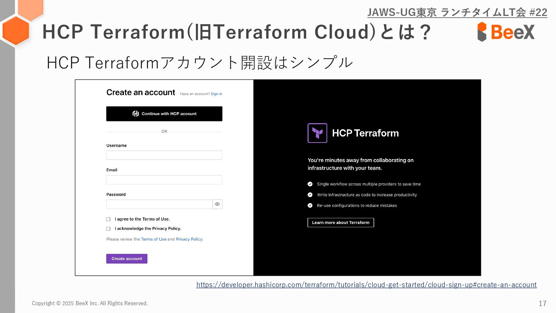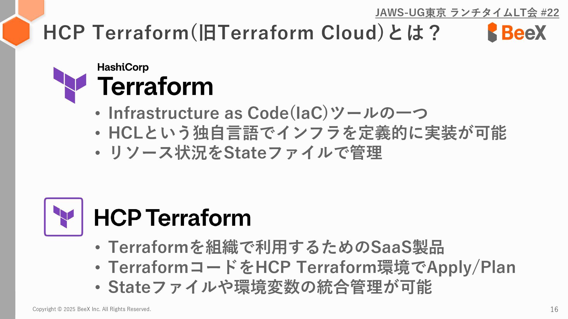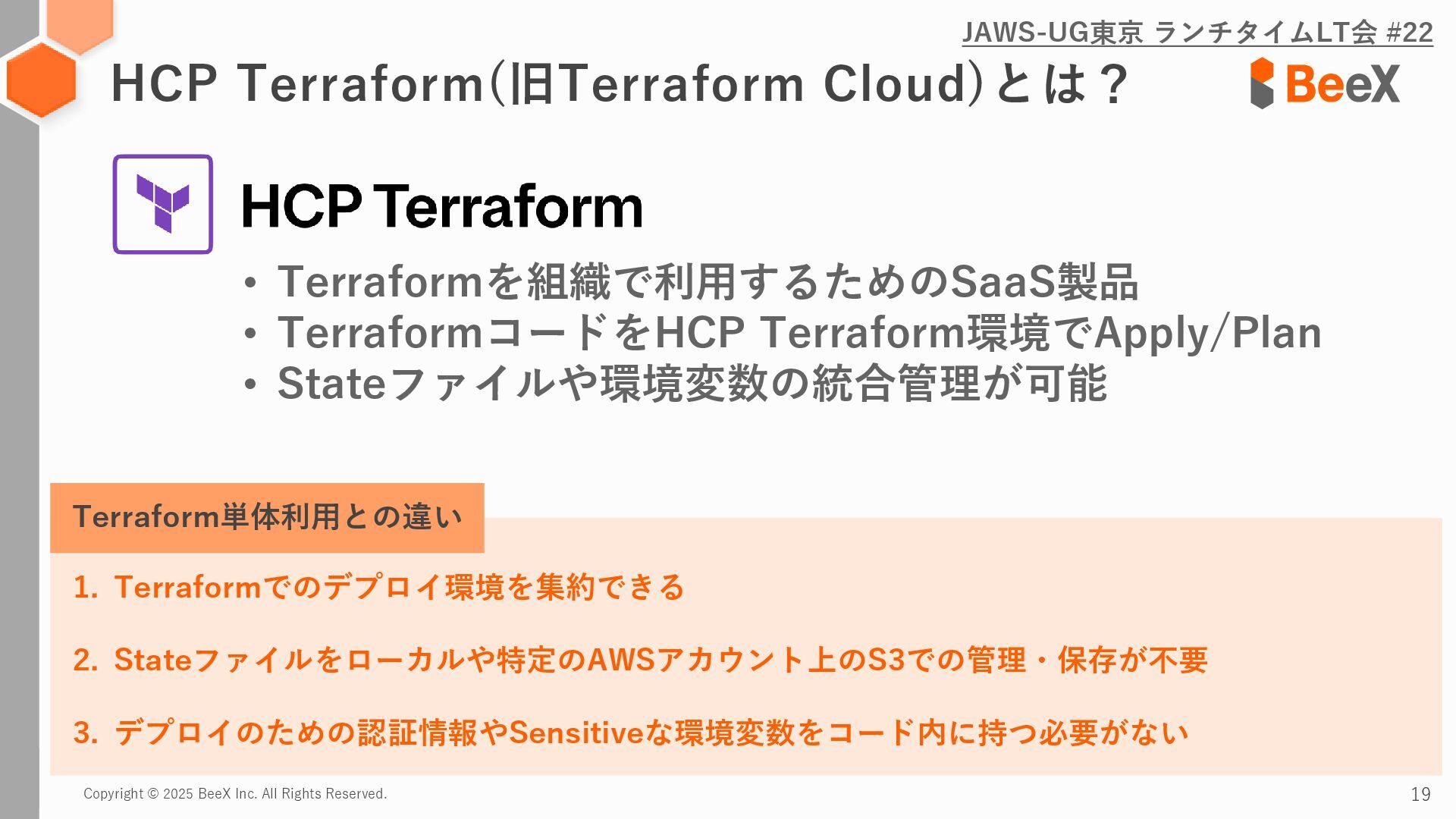 TerraformによるOrganizations利用構成例 実行環境 Organization Project Workspace(管理アカウント用) リソース 変数 トークン Workspace(検証アカウント用) リソース 変数 トークン AWS環境 Organizations IAM Role IAM OIDC ID Provider OpenID Provider IAM Role IAM OIDC ID Provider IAM Role : アカウント払い出し : リソース払い出し 自動構築 範囲 Terraform コード AWSアカウント AWSアカウント(管理アカウント) JAWS-UG東京 ランチタイムLT会 #22