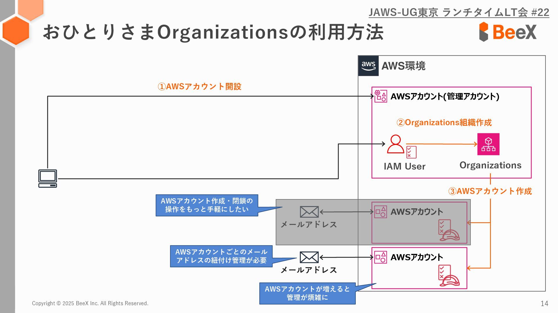 TerraformによるOrganizations利用構成例 実行環境 Organization Project Workspace(管理アカウント用) リソース 変数 トークン Workspace(検証アカウント用) リソース 変数 トークン AWS環境 Organizations IAM Role AWSアカウント IAM OIDC ID Provider OpenID Provider IAM Role IAM OIDC ID Provider IAM Role : アカウント払い出し : リソース払い出し Terraform コード AWSアカウント(管理アカウント) JAWS-UG東京 ランチタイムLT会 #22