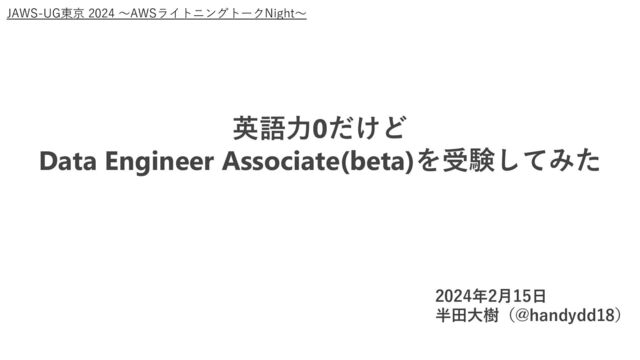 英語力0だけど Data Engineer Associate(beta)を受験してみた 2024年2月15日 半田大樹(@handydd18) JAWS-UG東京 2024 〜AWSライトニングトークNight〜