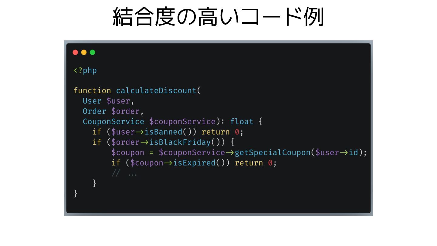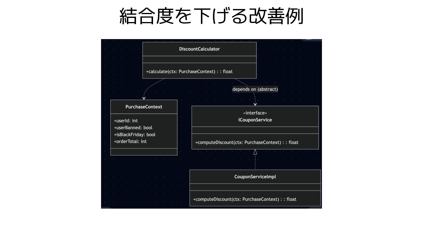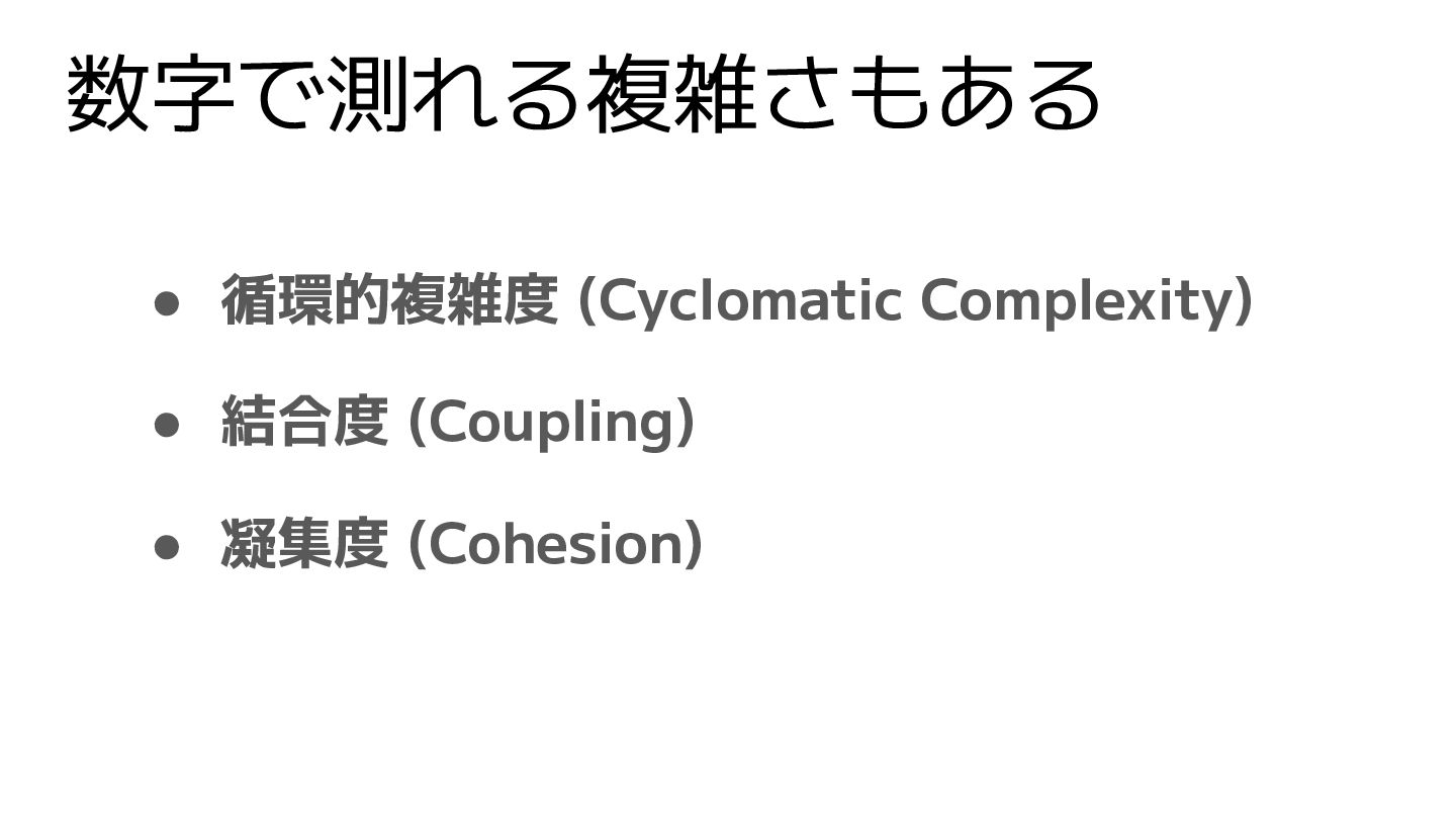 数字で測れる複雑さもある • 循環的複雑度 (Cyclomatic Complexity) • 結合度 (Coupling) • 凝集度