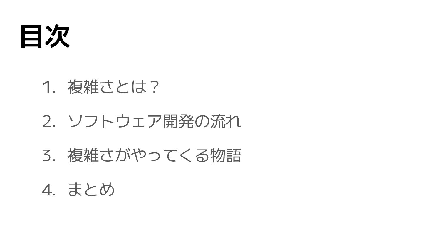 目次 1. 複雑さとは? 2. ソフトウェア開発の流れ 3. 複雑さがやってくる物語 4. まとめ