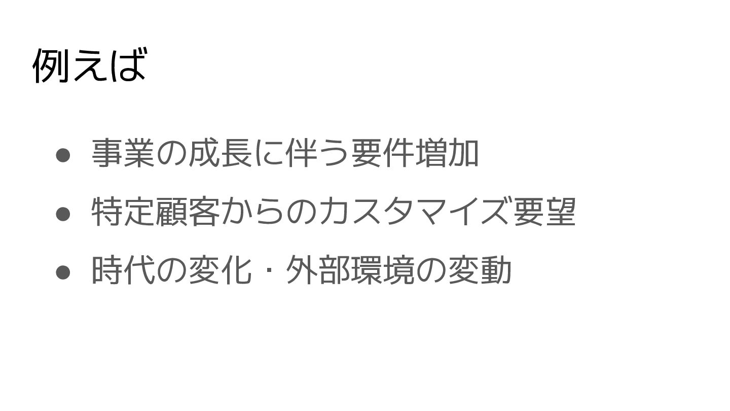 例えば • 事業の成長に伴う要件増加 • 特定顧客からのカスタマイズ要望 • 時代の変化・外部環境の変動