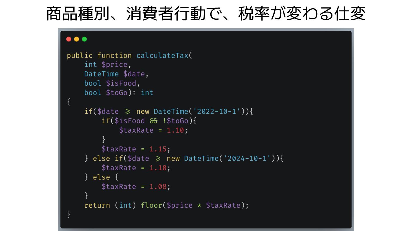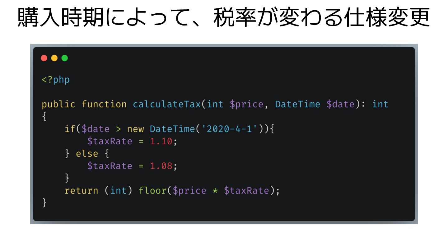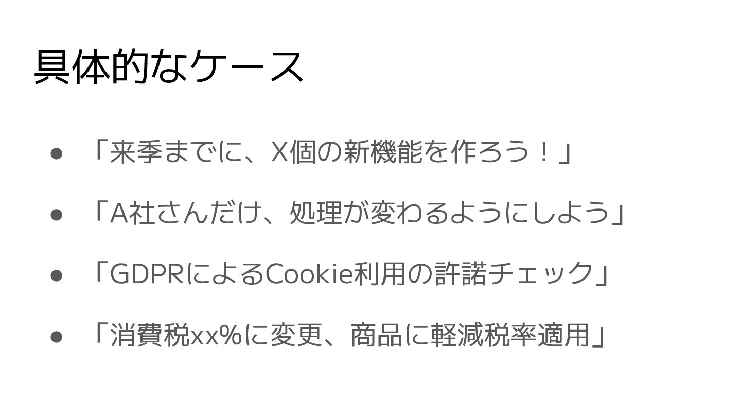 具体的なケース • 「来季までに、X個の新機能を作ろう!」 • 「A社さんだけ、処理が変わるようにしよう」 • 「GDPRによるCookie利用の許諾チェック」 • 「消費税xx%に変更、商品に軽減税率適用」
