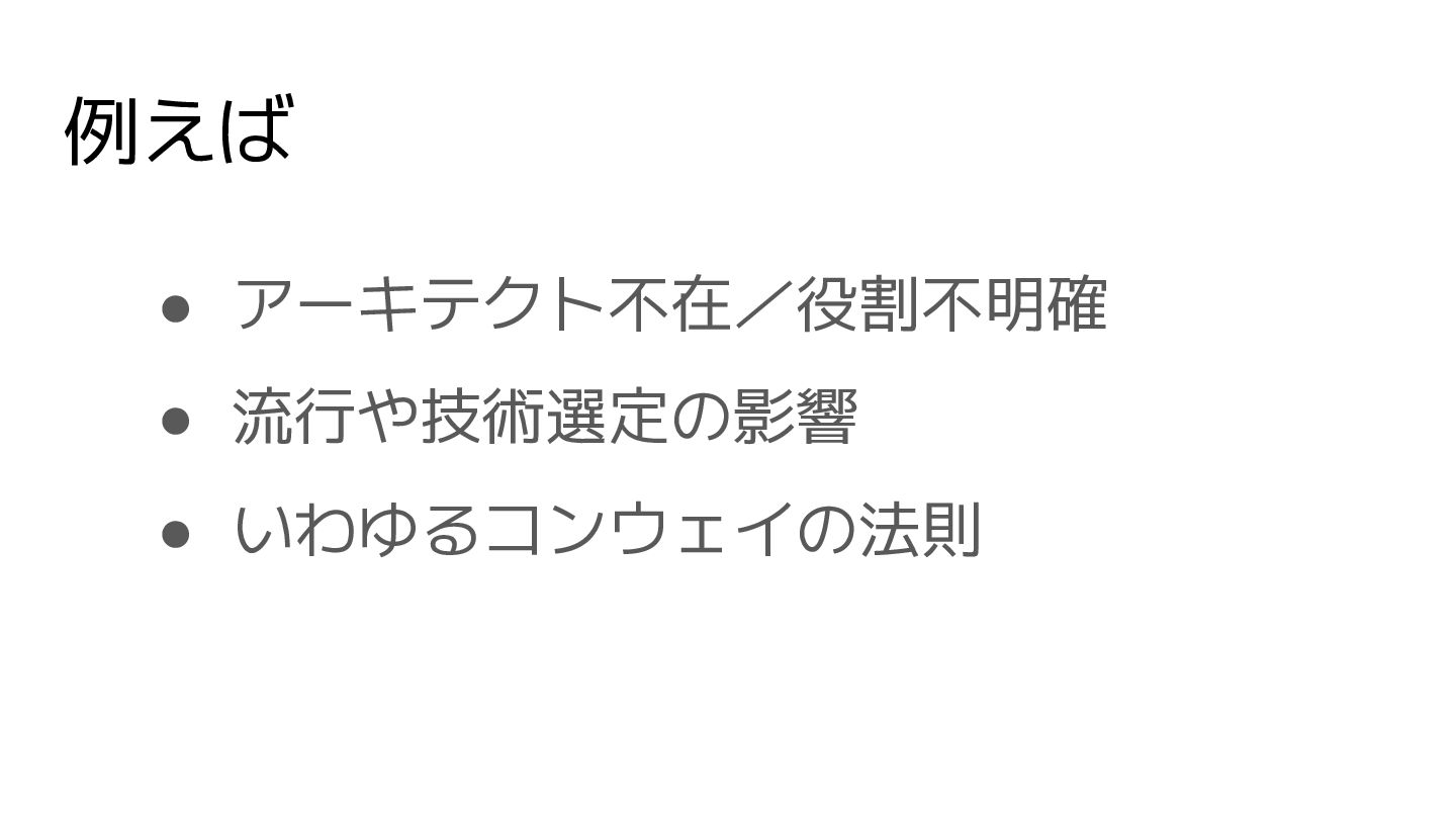例えば • アーキテクト不在/役割不明確 • 流行や技術選定の影響 • いわゆるコンウェイの法則