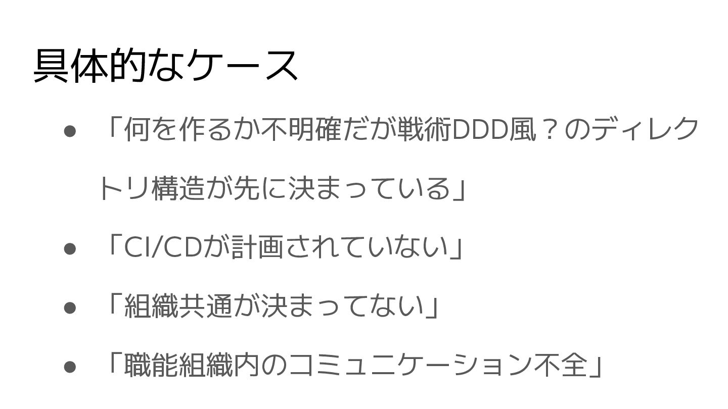 具体的なケース • 「何を作るか不明確だが戦術DDD風?のディレク トリ構造が先に決まっている」 • 「CI/CDが計画されていない」 • 「組織共通が決まってない」 • 「職能組織内のコミュニケーション不全」