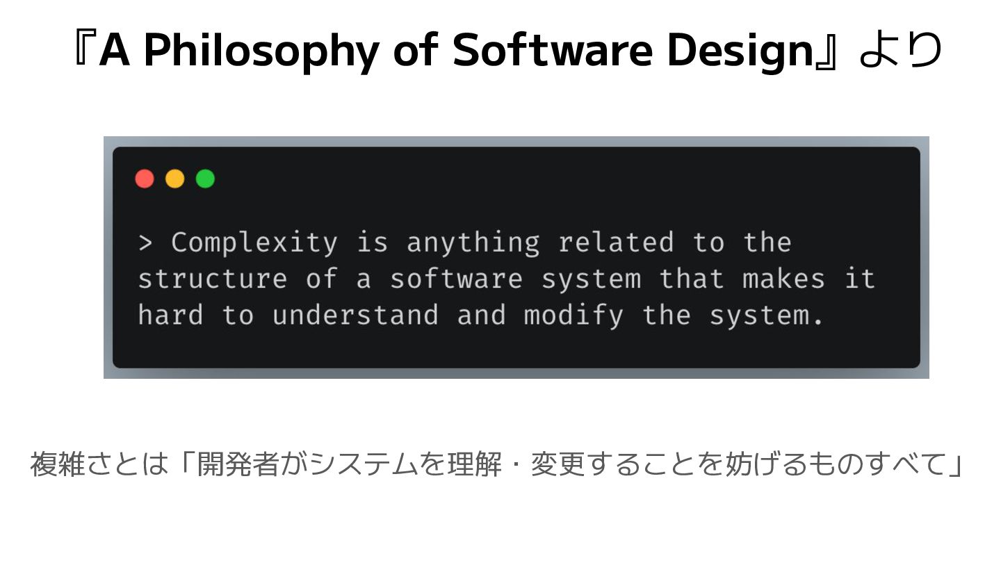 『A Philosophy of Software Design』より 複雑さとは「開発者がシステムを理解・変更することを妨げるものすべて」