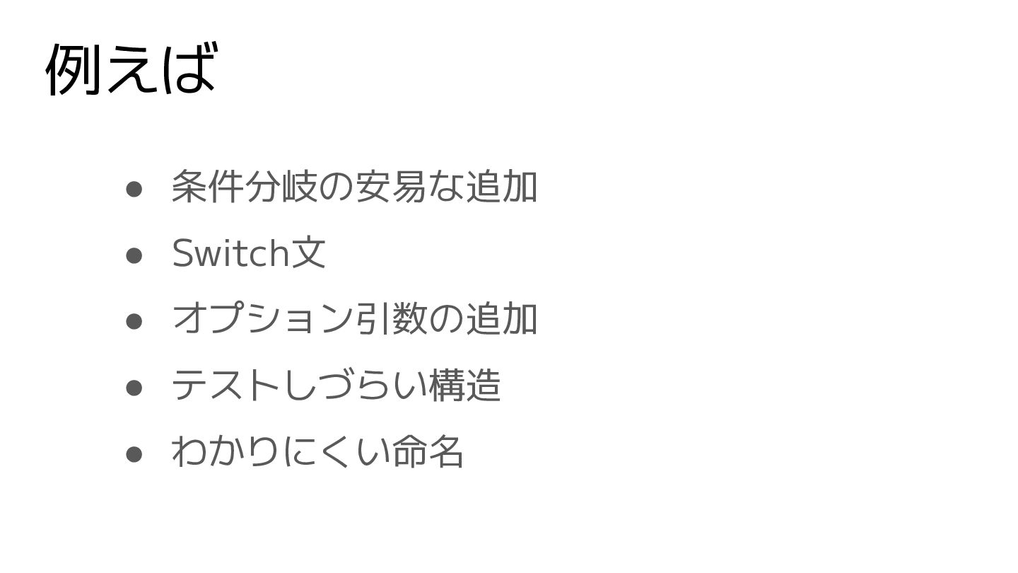 例えば • 条件分岐の安易な追加 • Switch文 • オプション引数の追加 • テストしづらい構造 •