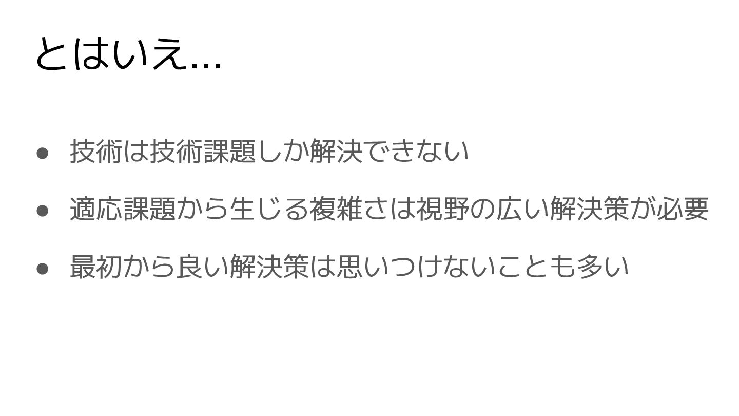 とはいえ... • 技術は技術課題しか解決できない • 適応課題から生じる複雑さは視野の広い解決策が必要 • 最初から良い解決策は思いつけないことも多い