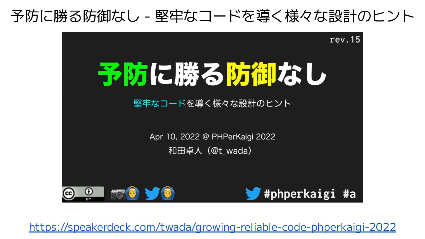 予防に勝る防御なし - 堅牢なコードを導く様々な設計のヒント https://speakerdeck.com/twada/growing-reliable-code-phperkaigi-2022