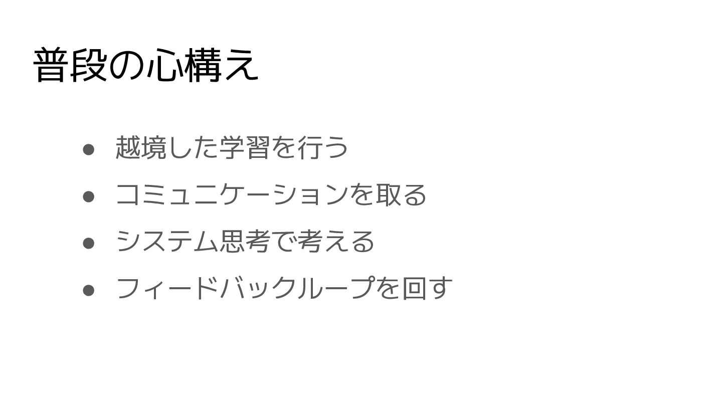 普段の心構え • 越境した学習を行う • コミュニケーションを取る • システム思考で考える • フィードバックループを回す