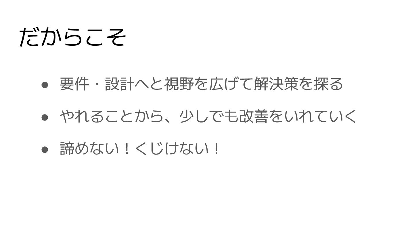 だからこそ • 要件・設計へと視野を広げて解決策を探る • やれることから、少しでも改善をいれていく • 諦めない!くじけない!