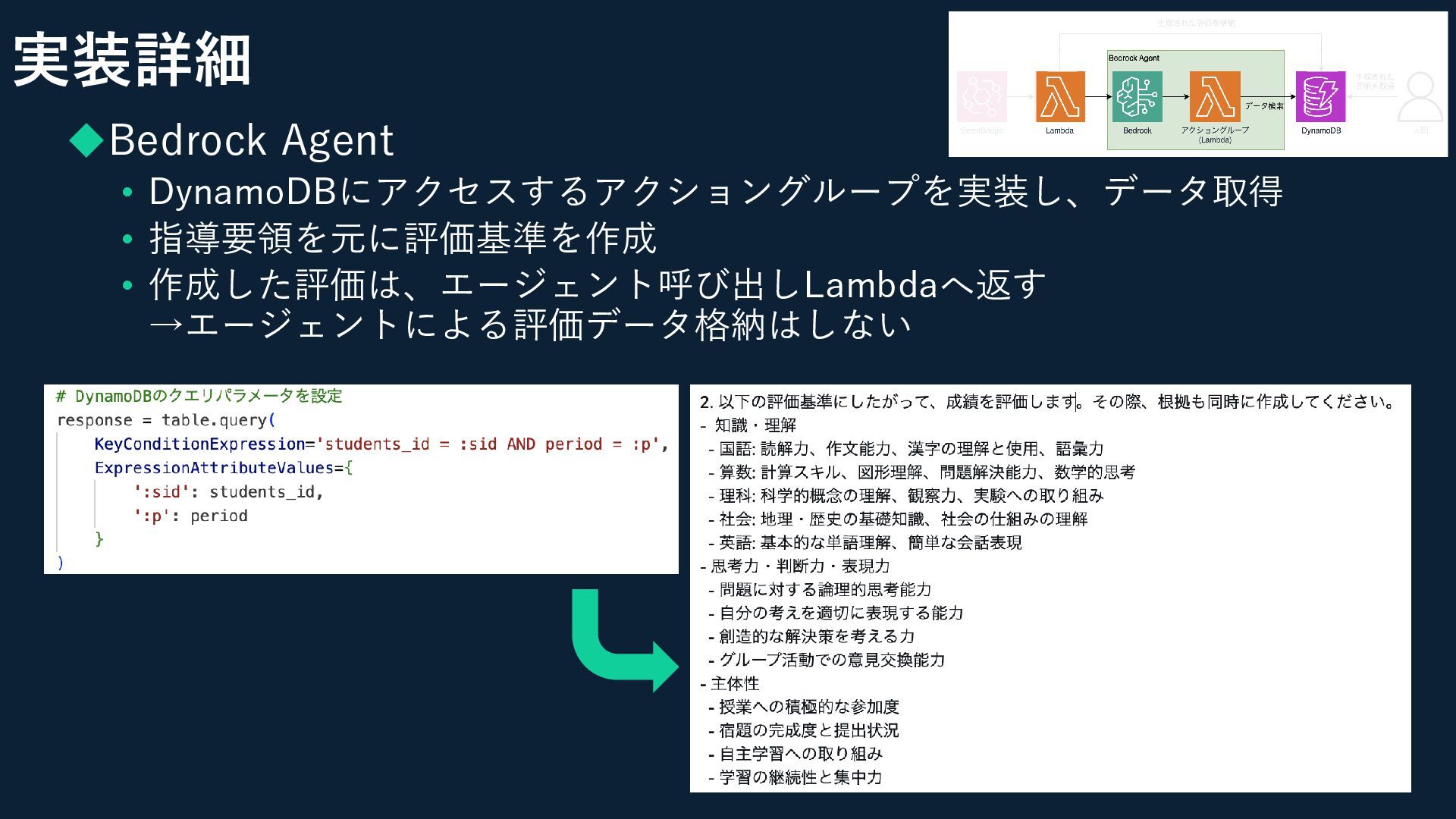 実装詳細 ◆Bedrock Agent • DynamoDBにアクセスするアクショングループを実装し、データ取得 • 指導要領を元に評価基準を作成 • 作成した評価は、エージェント呼び出しLambdaへ返す →エージェントによる評価データ格納はしない