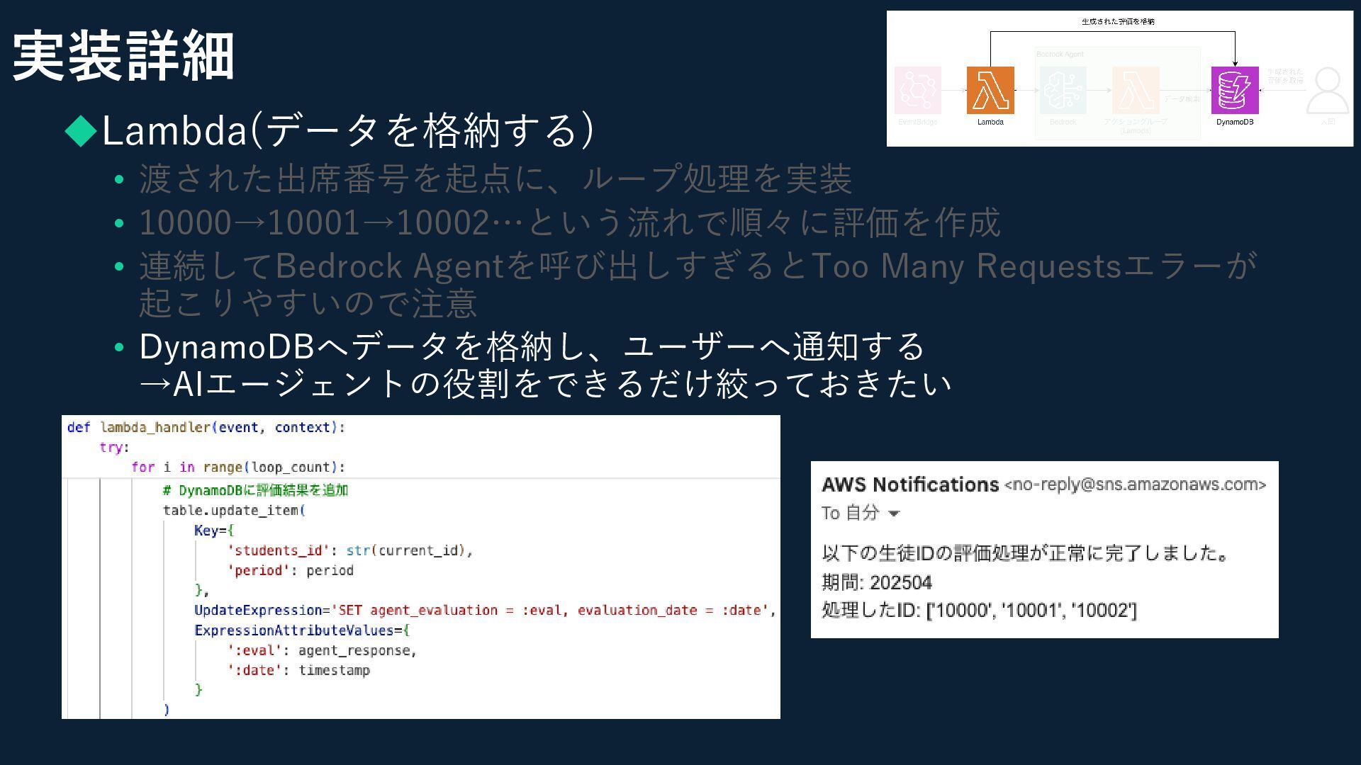 実装詳細 ◆Lambda(データを格納する) • 渡された出席番号を起点に、ループ処理を実装 • 10000→10001→10002…という流れで順々に評価を作成 • 連続してBedrock Agentを呼び出しすぎるとToo Many