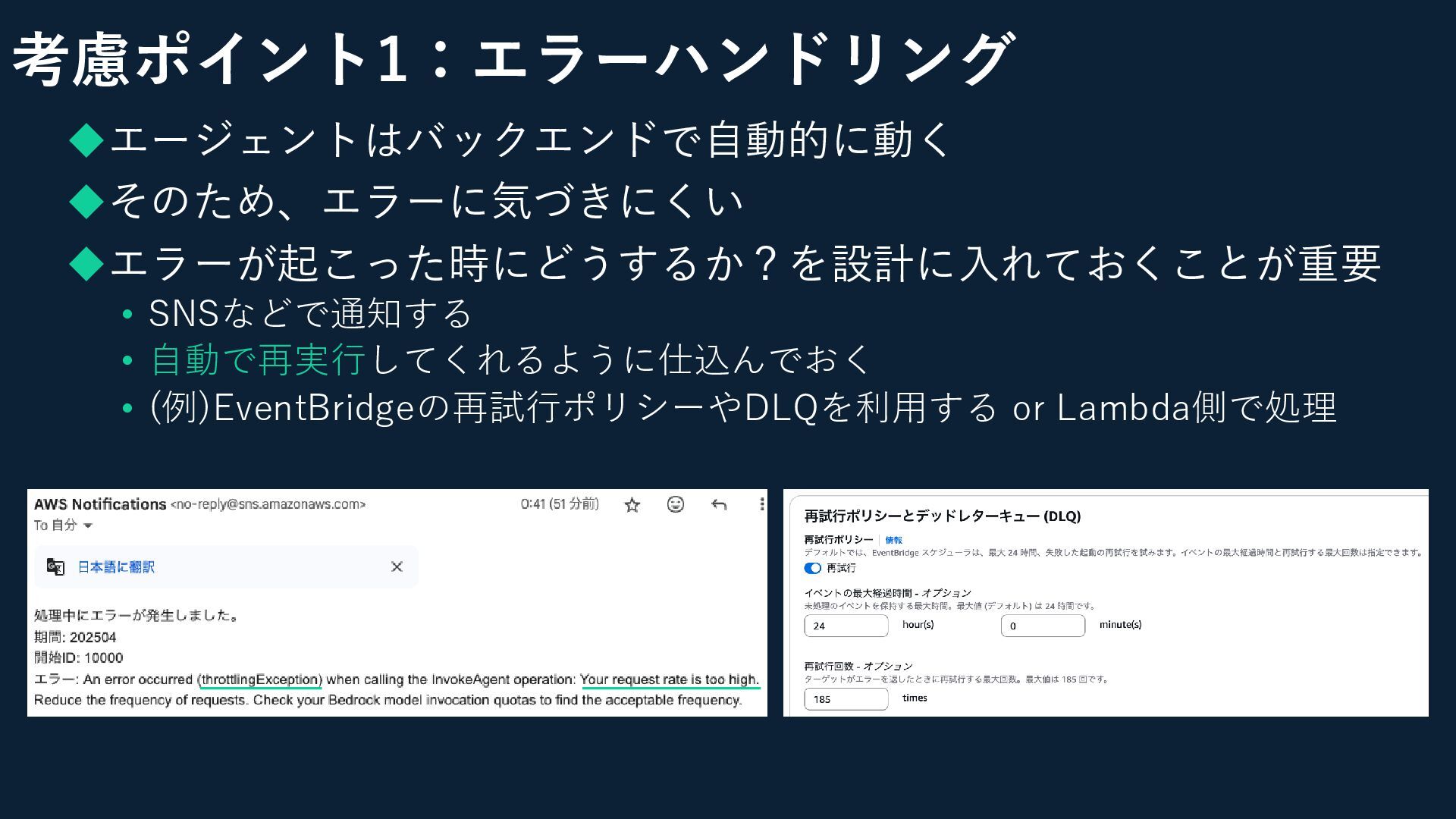 考慮ポイント1:エラーハンドリング ◆エージェントはバックエンドで自動的に動く ◆そのため、エラーに気づきにくい ◆エラーが起こった時にどうするか?を設計に入れておくことが重要 • SNSなどで通知する • 自動で再実行してくれるように仕込んでおく • (例)EventBridgeの再試行ポリシーやDLQを利用する