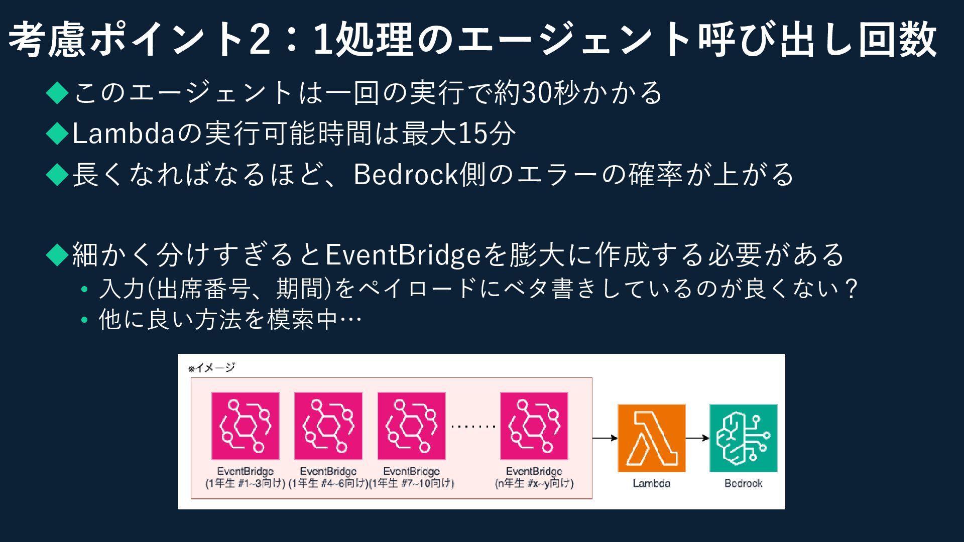 考慮ポイント2:1処理のエージェント呼び出し回数 ◆このエージェントは一回の実行で約30秒かかる ◆Lambdaの実行可能時間は最大15分 ◆長くなればなるほど、Bedrock側のエラーの確率が上がる ◆細かく分けすぎるとEventBridgeを膨大に作成する必要がある • 入力(出席番号、期間)をペイロードにベタ書きしているのが良くない? • 他に良い方法を模索中…