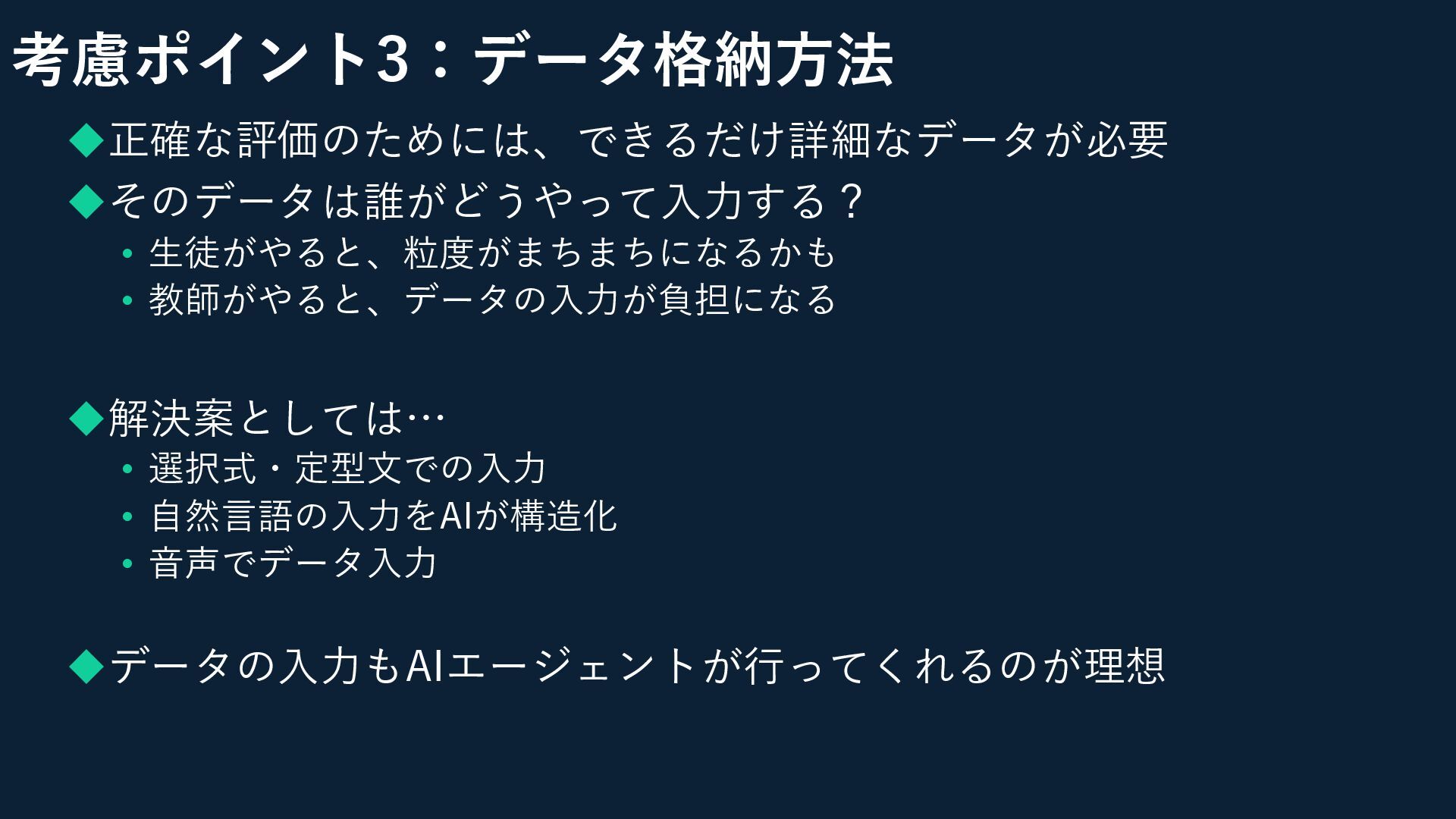 考慮ポイント3:データ格納方法 ◆正確な評価のためには、できるだけ詳細なデータが必要 ◆そのデータは誰がどうやって入力する? • 生徒がやると、粒度がまちまちになるかも • 教師がやると、データの入力が負担になる ◆解決案としては… • 選択式・定型文での入力