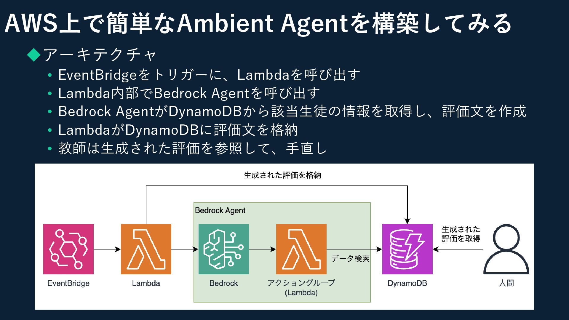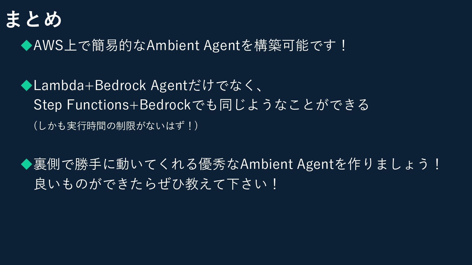 ◆AWS上で簡易的なAmbient Agentを構築可能です! ◆Lambda+Bedrock Agentだけでなく、 Step Functions+Bedrockでも同じようなことができる (しかも実行時間の制限がないはず!) ◆裏側で勝手に動いてくれる優秀なAmbient Agentを作りましょう! 良いものができたらぜひ教えて下さい!